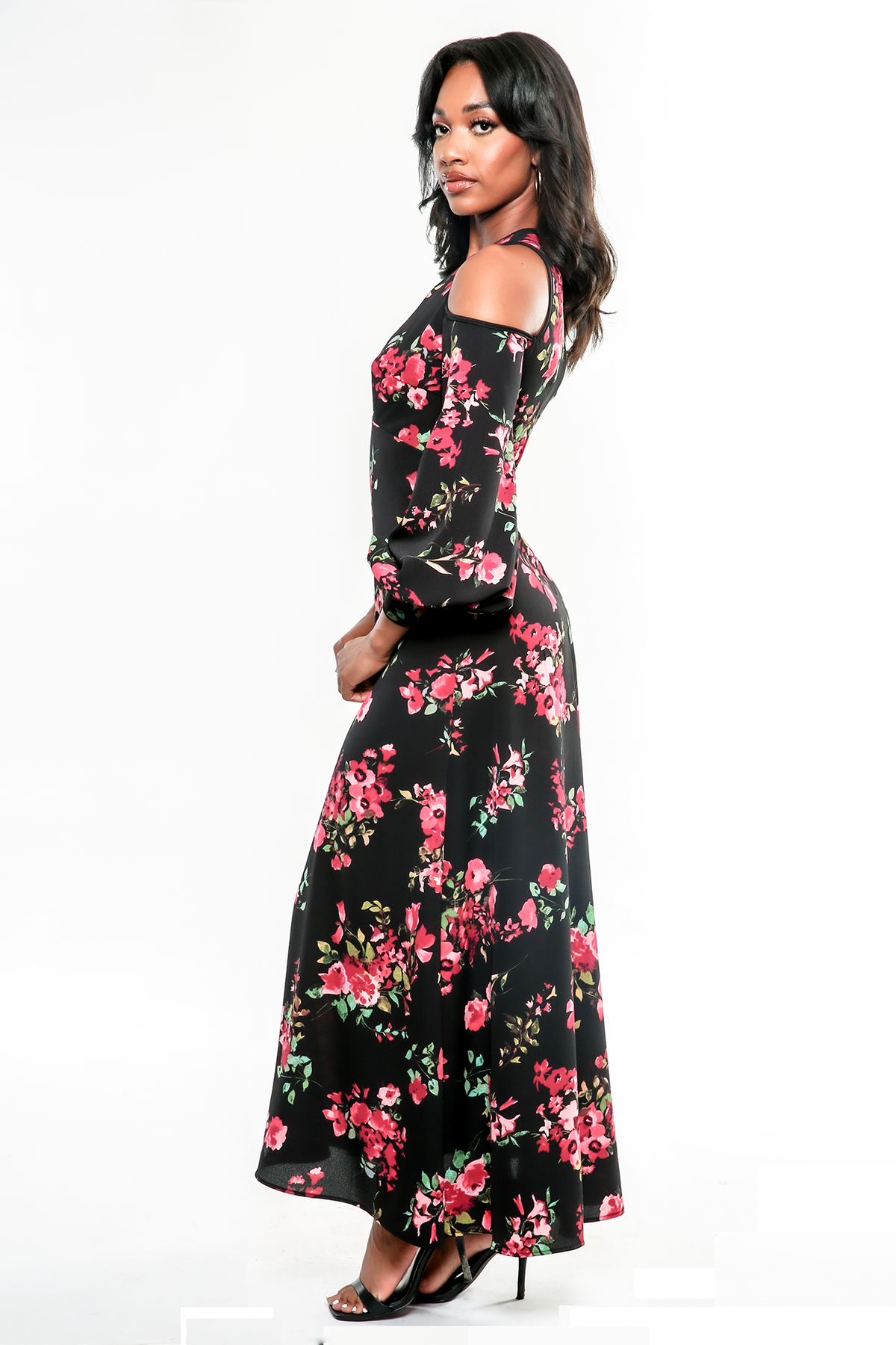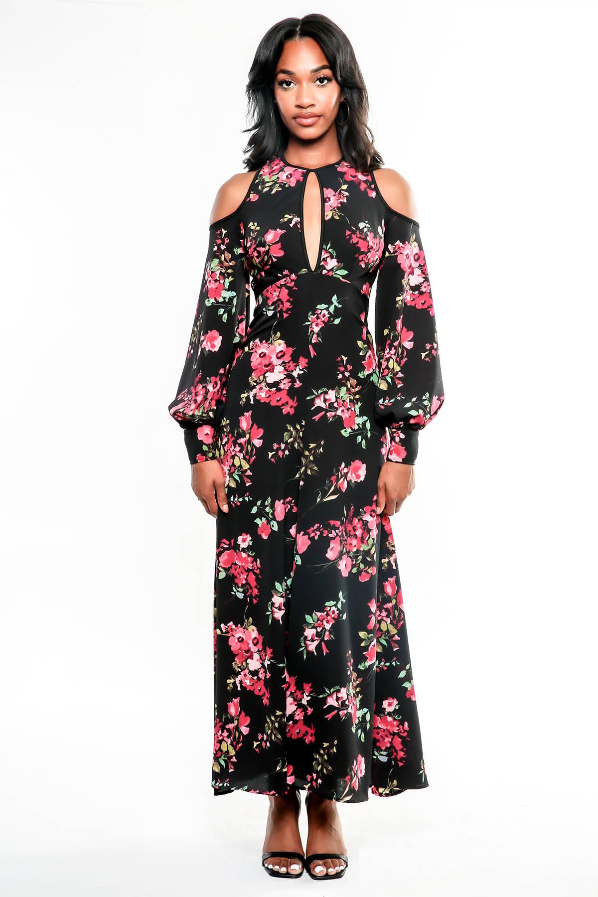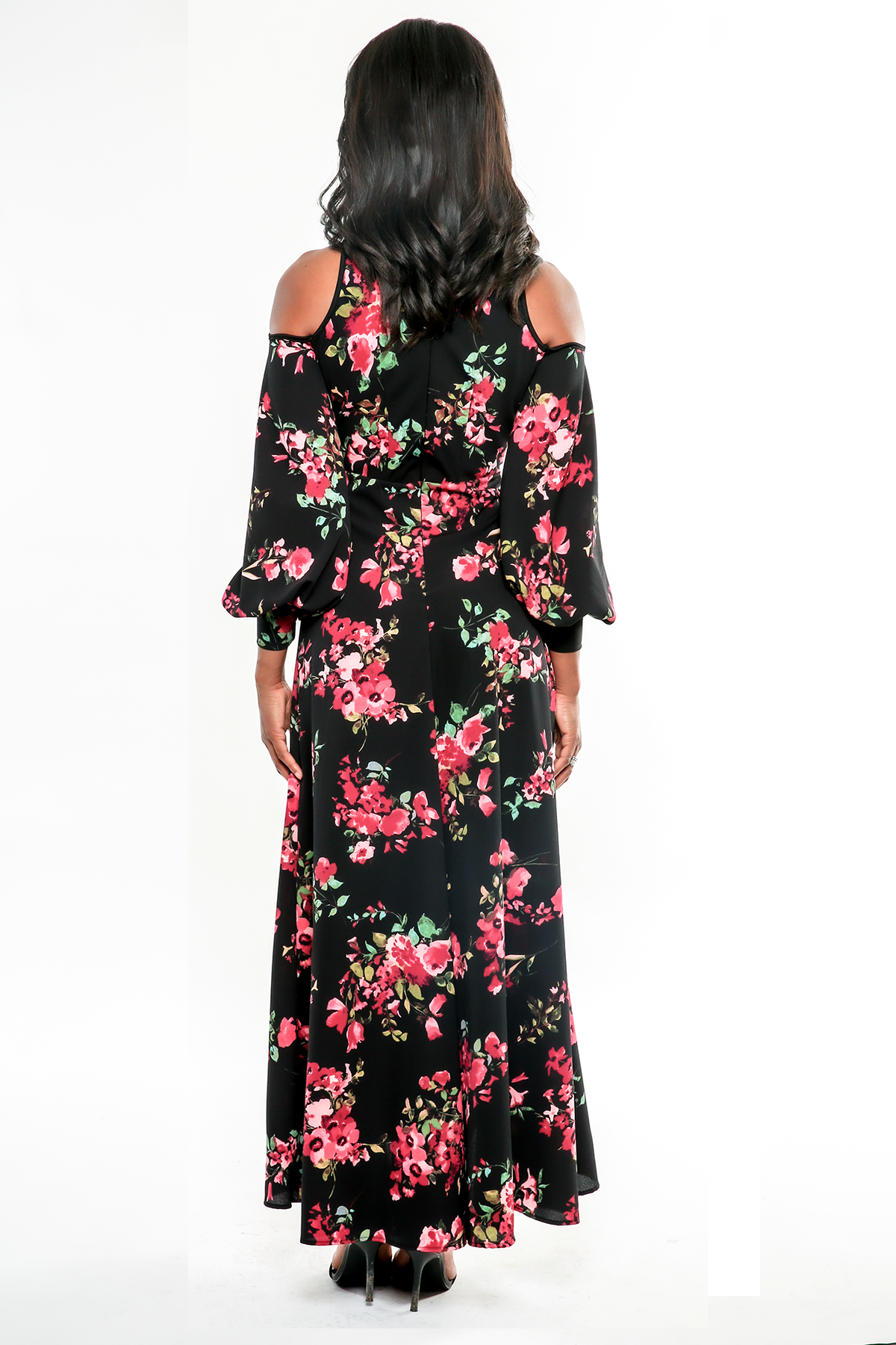 The Lilia is a maxi length dress with a fitted bodice and a halter collar neckline. It has an open slit at bodice front with bare shoulders that flow into a romantic gathered cuff sleeve.