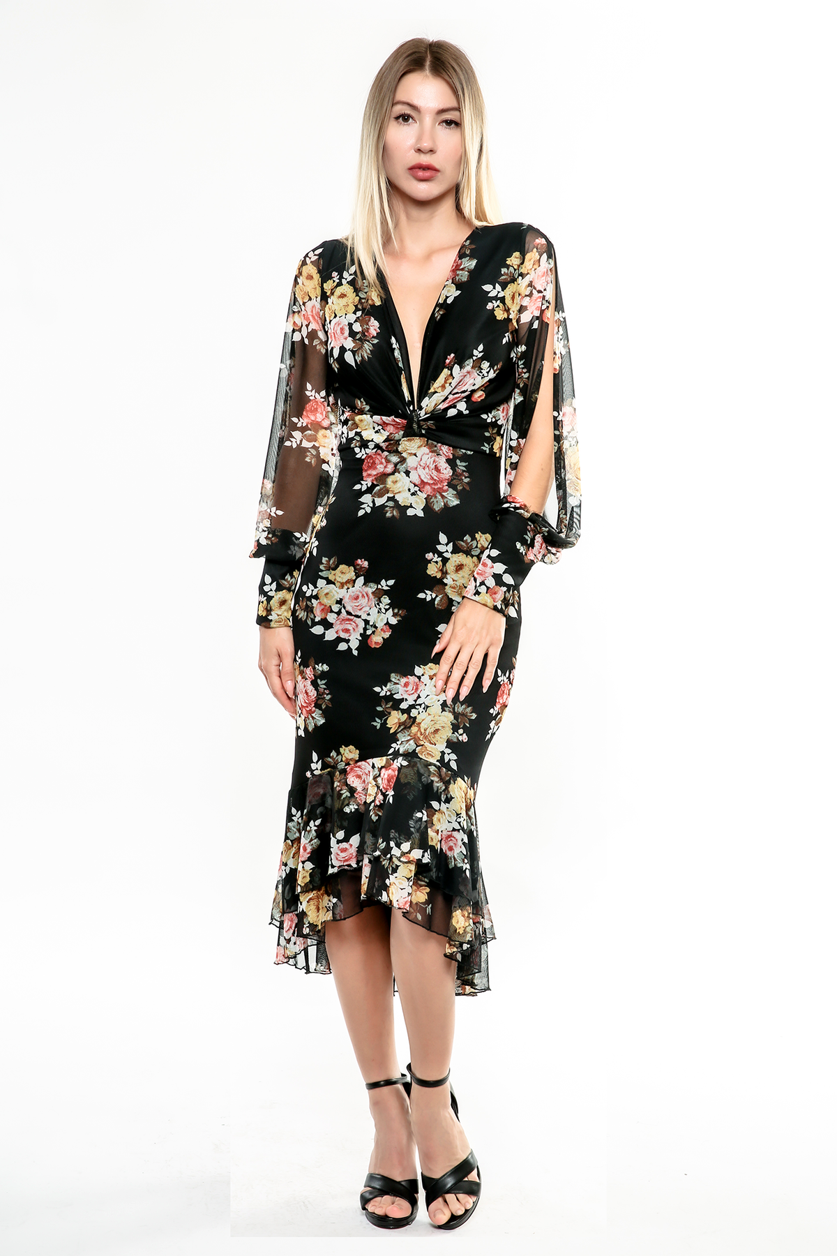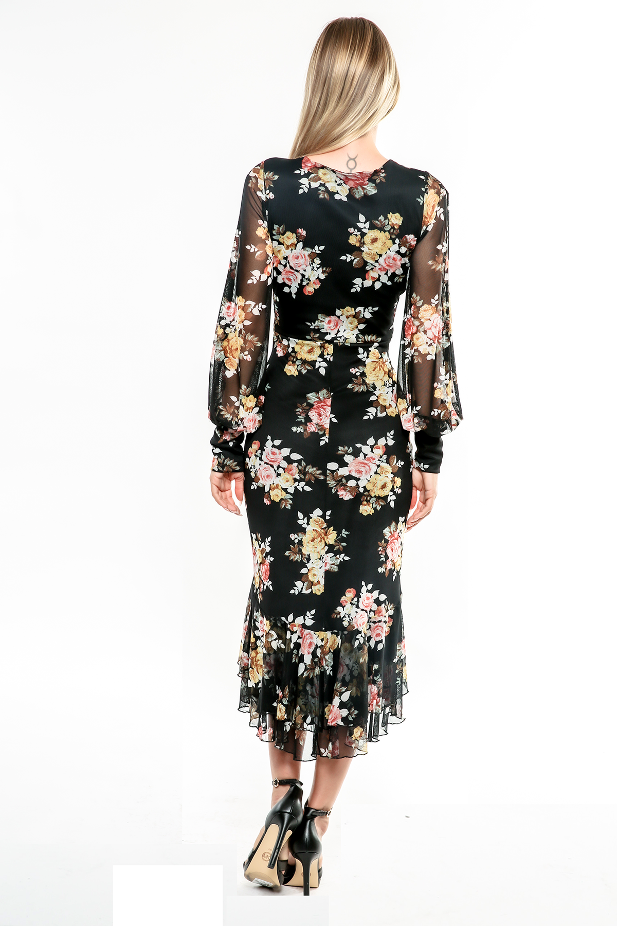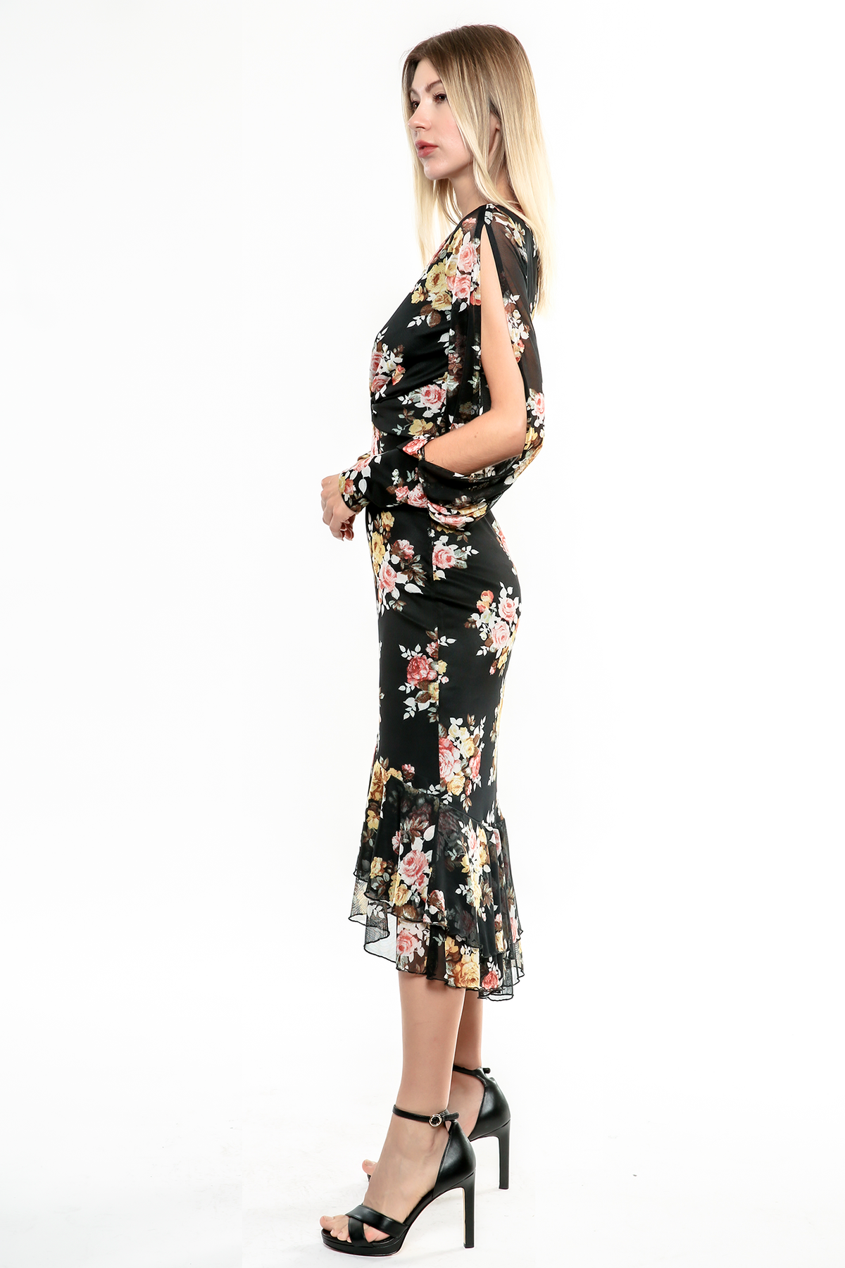 The Emilia has a plugging V-shaped neckline that gathers at the bust line. The bodice has a slim fitting silhouette and has double flounces at the hem. She is embellished with open gathered sleeves.