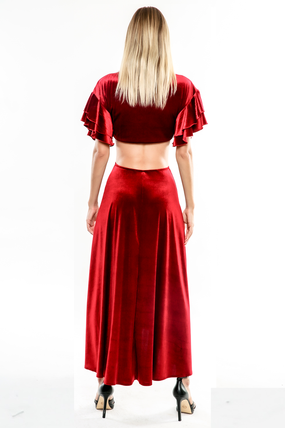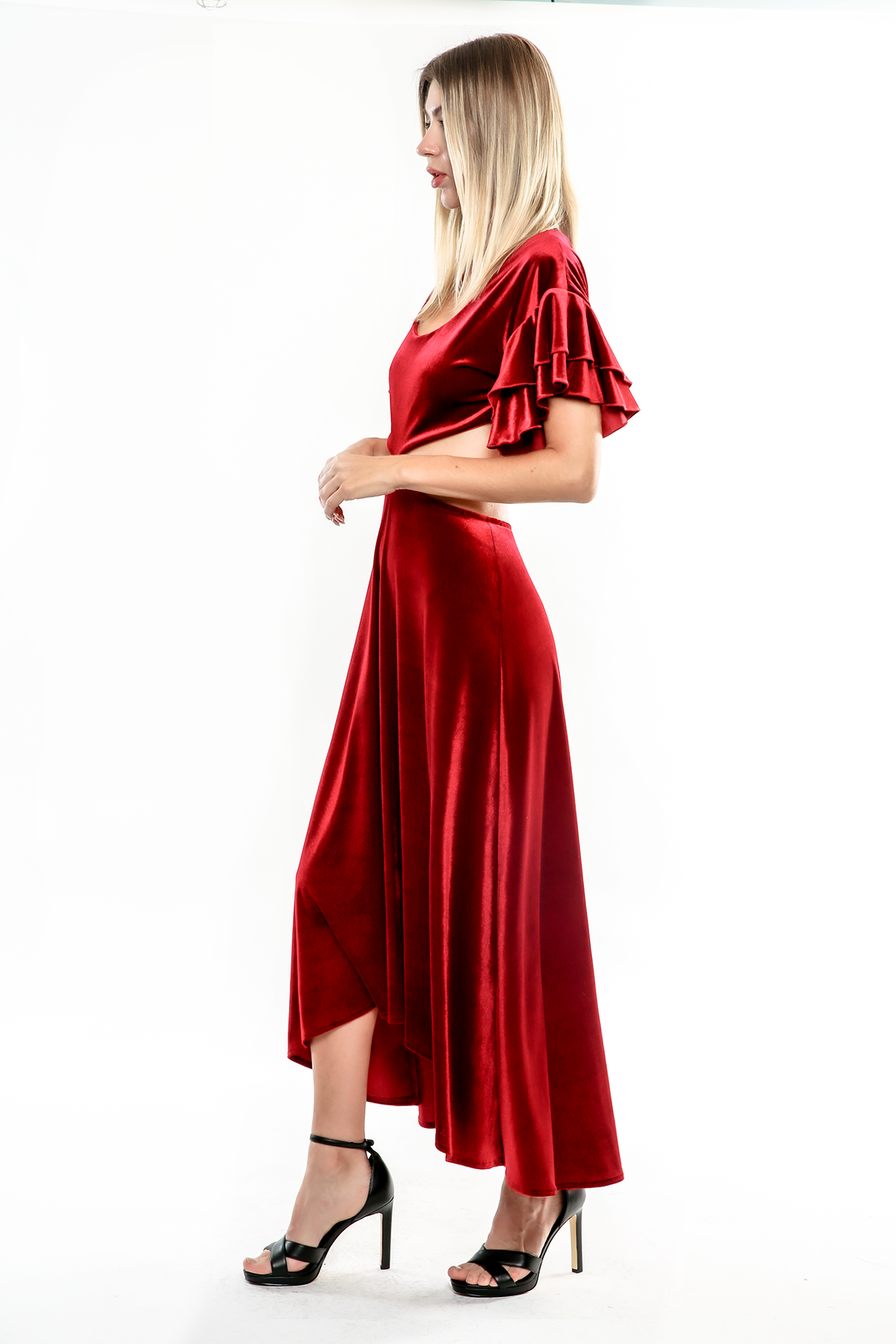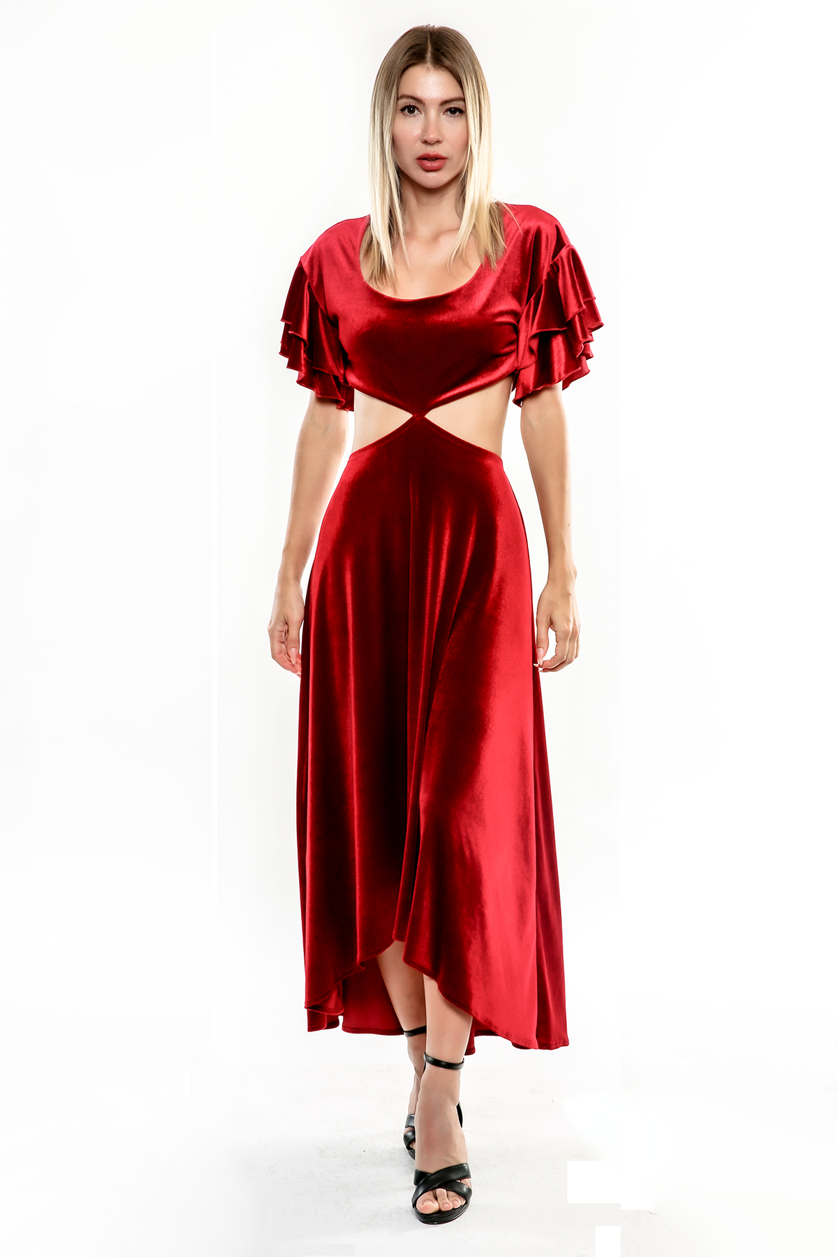 The Charlotte features a midriff cut out that continues to the back with a touch of flounce at sleeves. It's an A-line silhouette in stunning burgundy velvet.