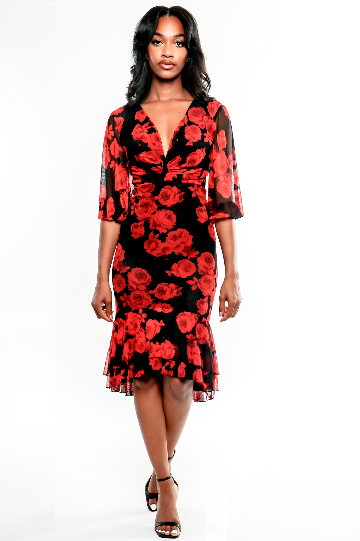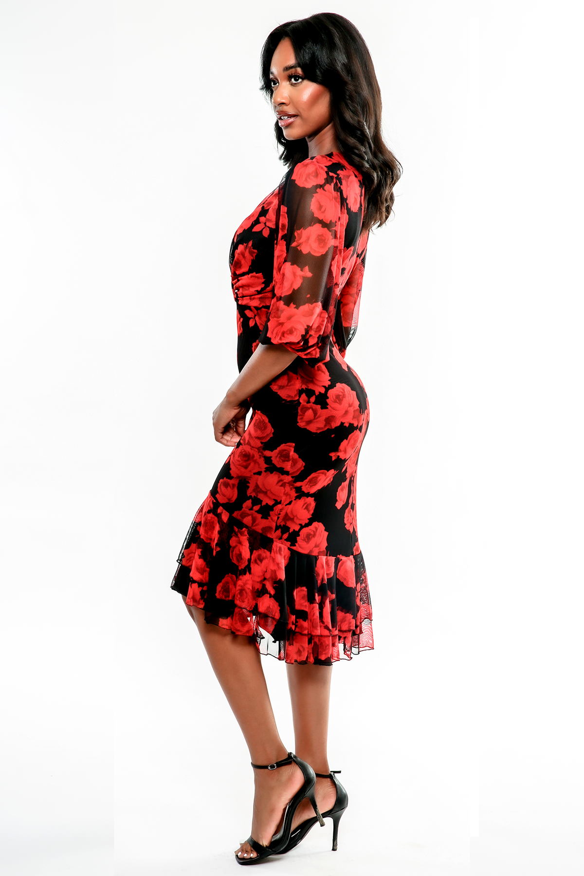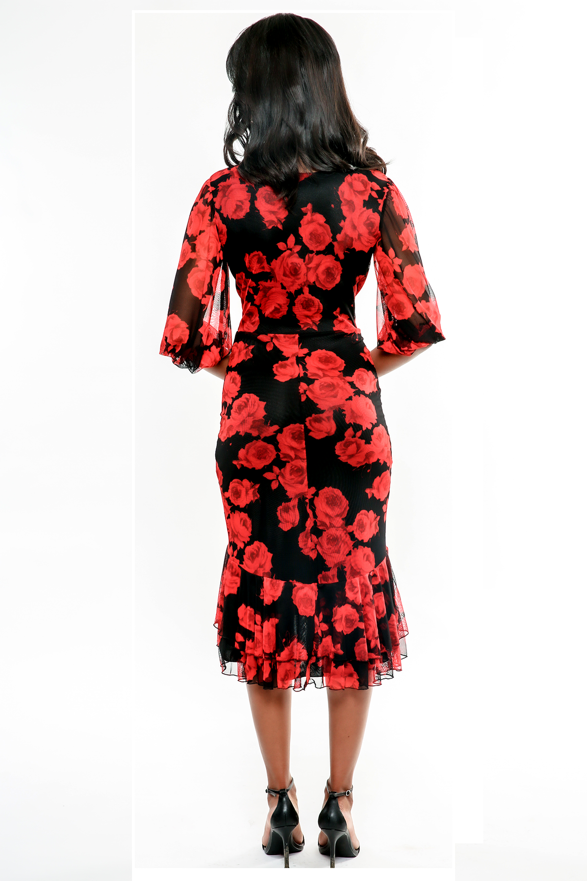 The Alice is made in a delicate rayon stretch mesh. It features a plugging V- shaped neckline, gatherers at bustline, with billowy sheered sleeves. The silhouette continues to a flirty double row flounces at hem.