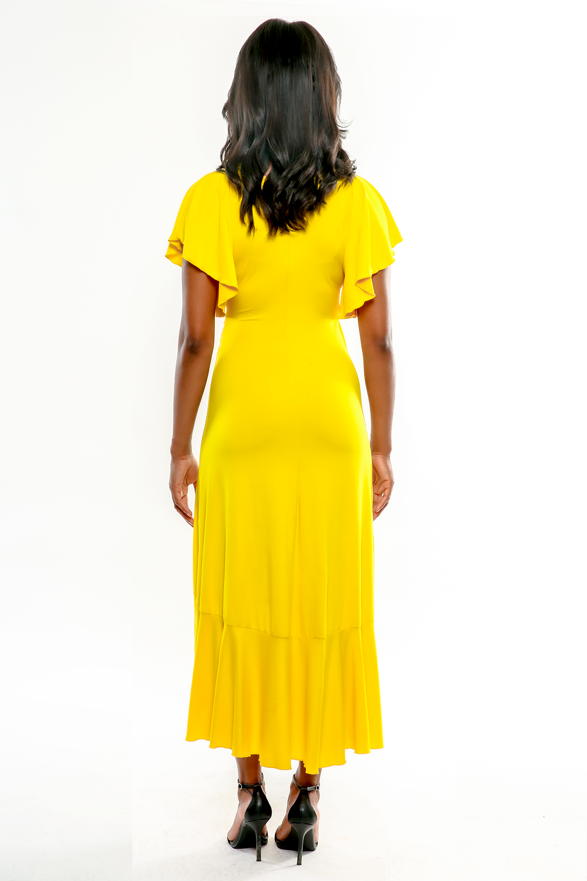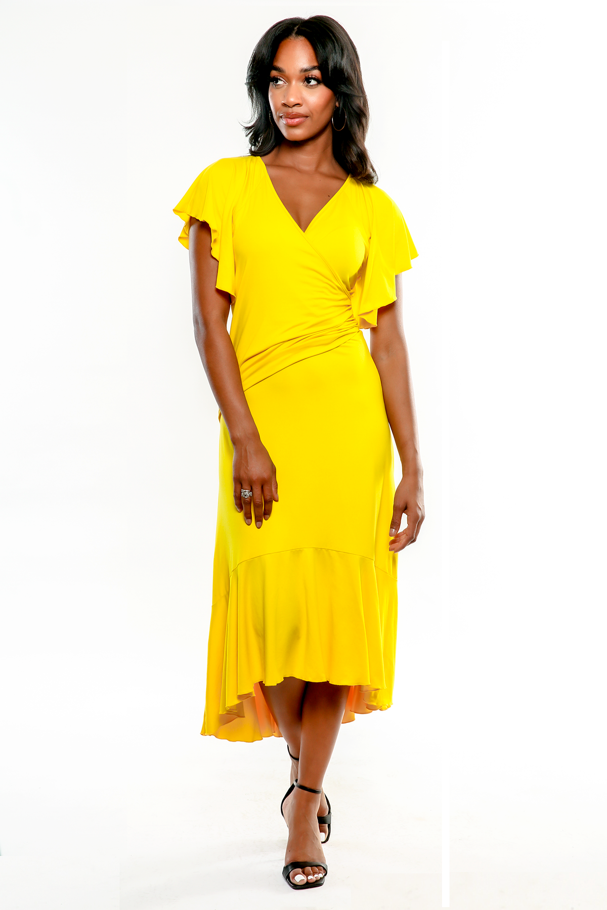 The Sienna has a wrap bodice with light sheering. She features delicate cascading sleeves and a flounce hem. While featuring a high-low midi lengths silhouette.