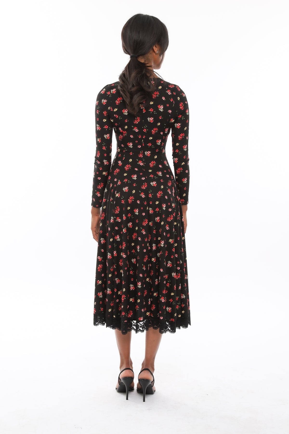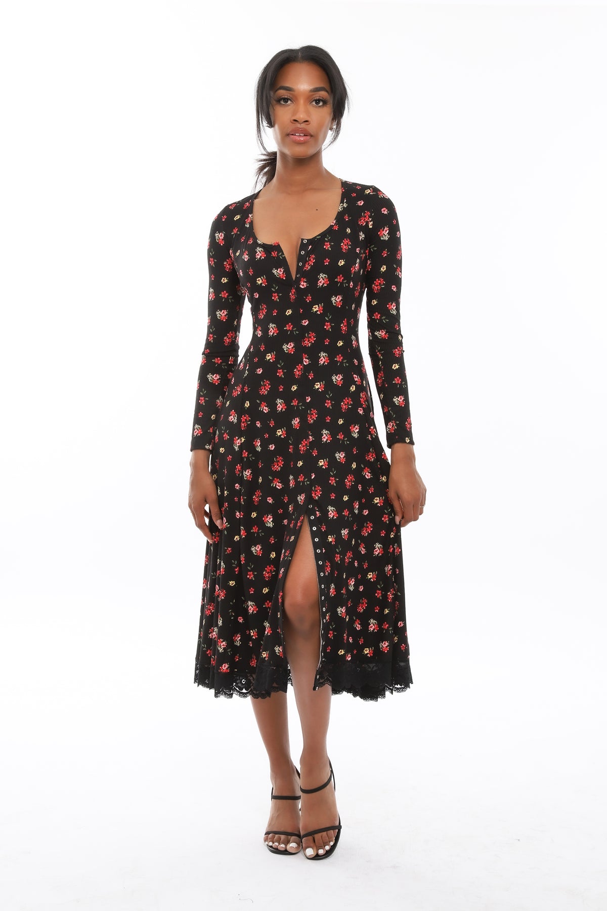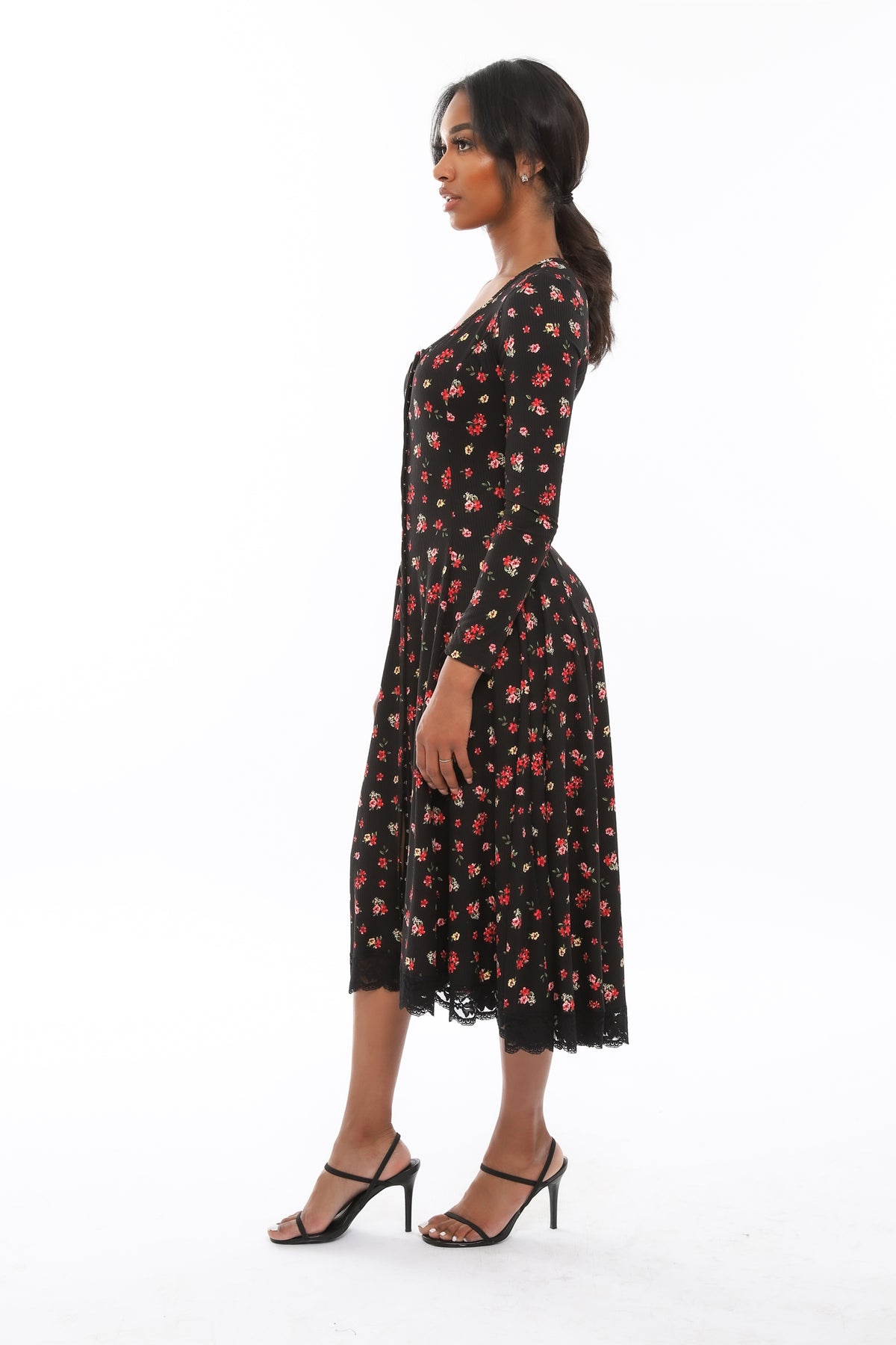 The Ava is a  princess-seamed silhouette with a snap closure detail and trimmed hem in black vintage lace.