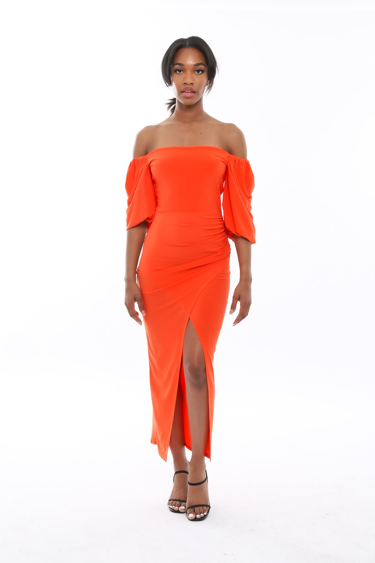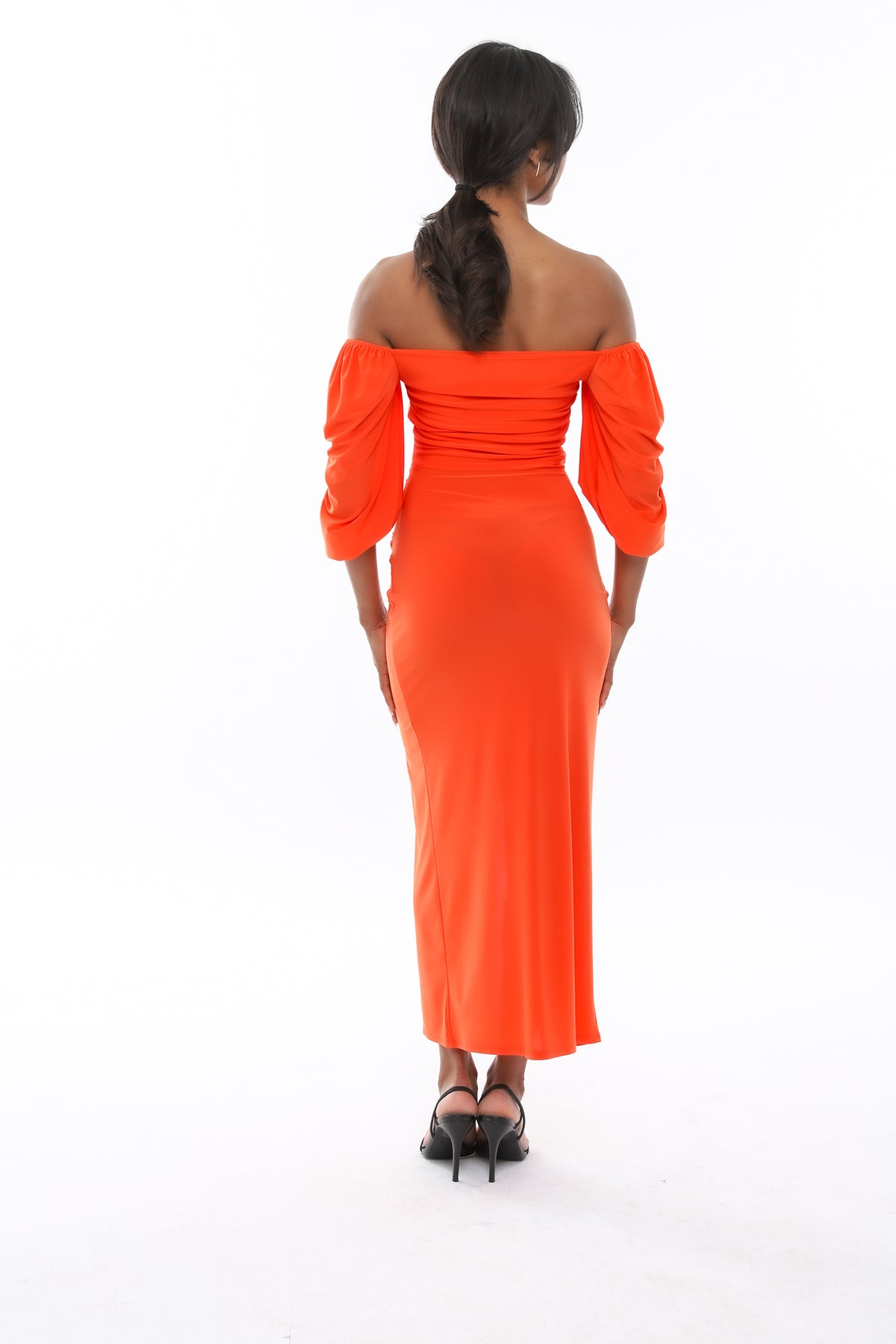 The Carla rocks a three-quarter rushed sleeve with a straight neckline and gathered faux wrap skirt. It is fitted throughout to give you that sleek look.