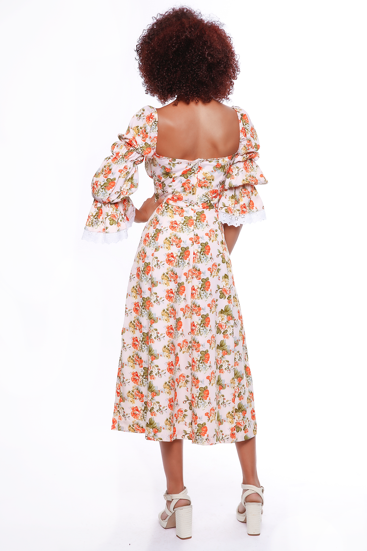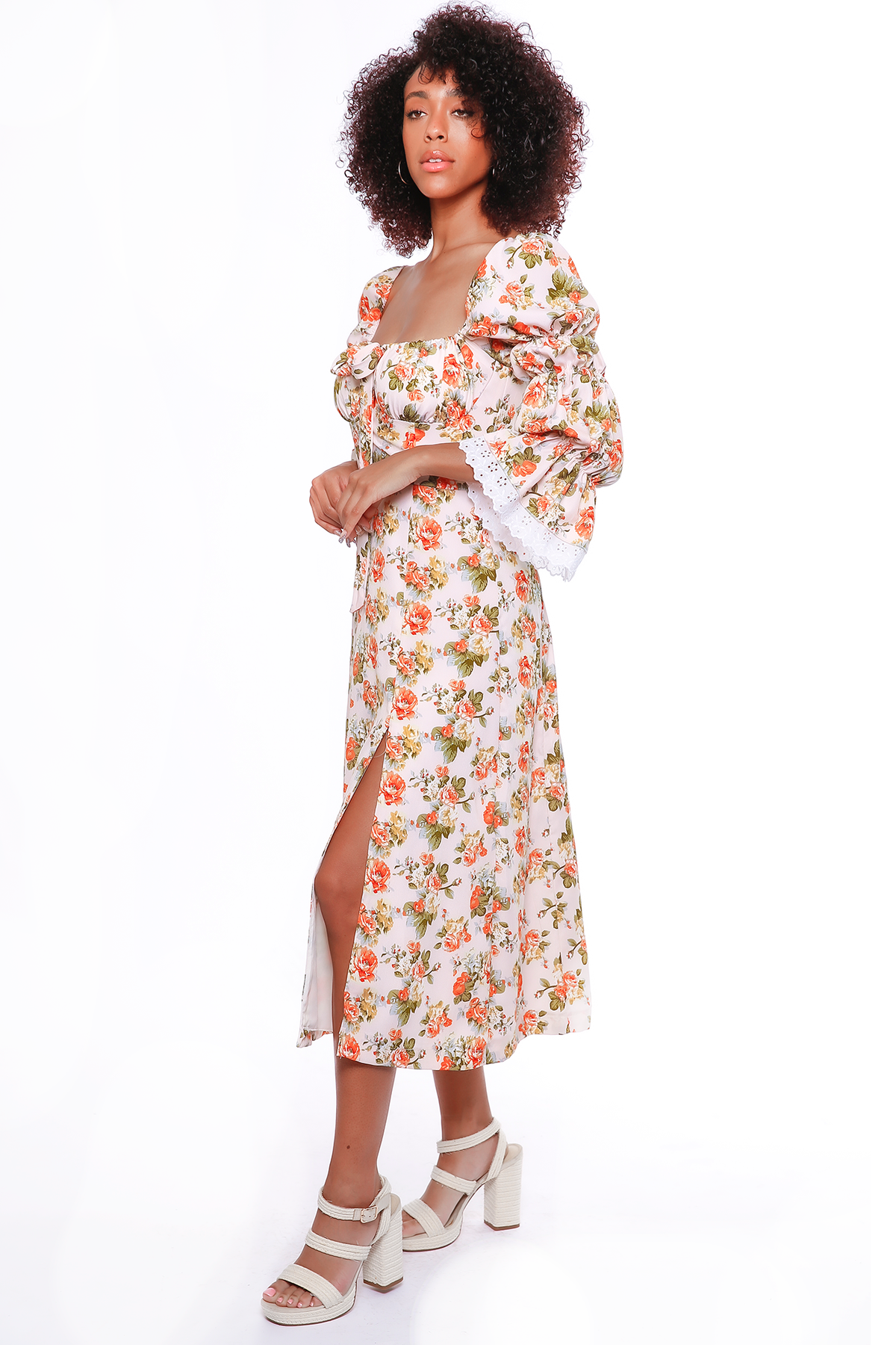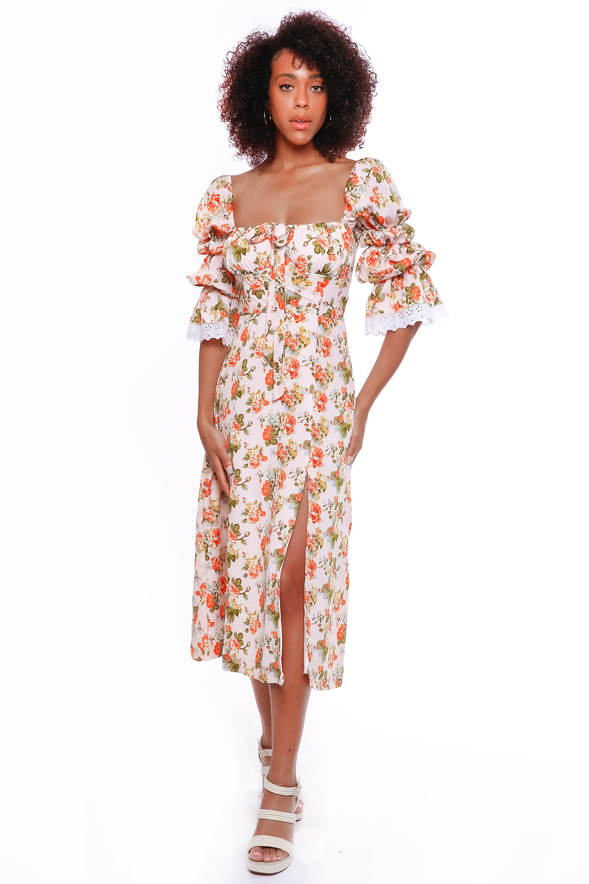 The Catherine is an A-line midi length dress with a gathered bust and a tie in the front. She has a side split and elastic puff sleeves with delicate lace detailing.
