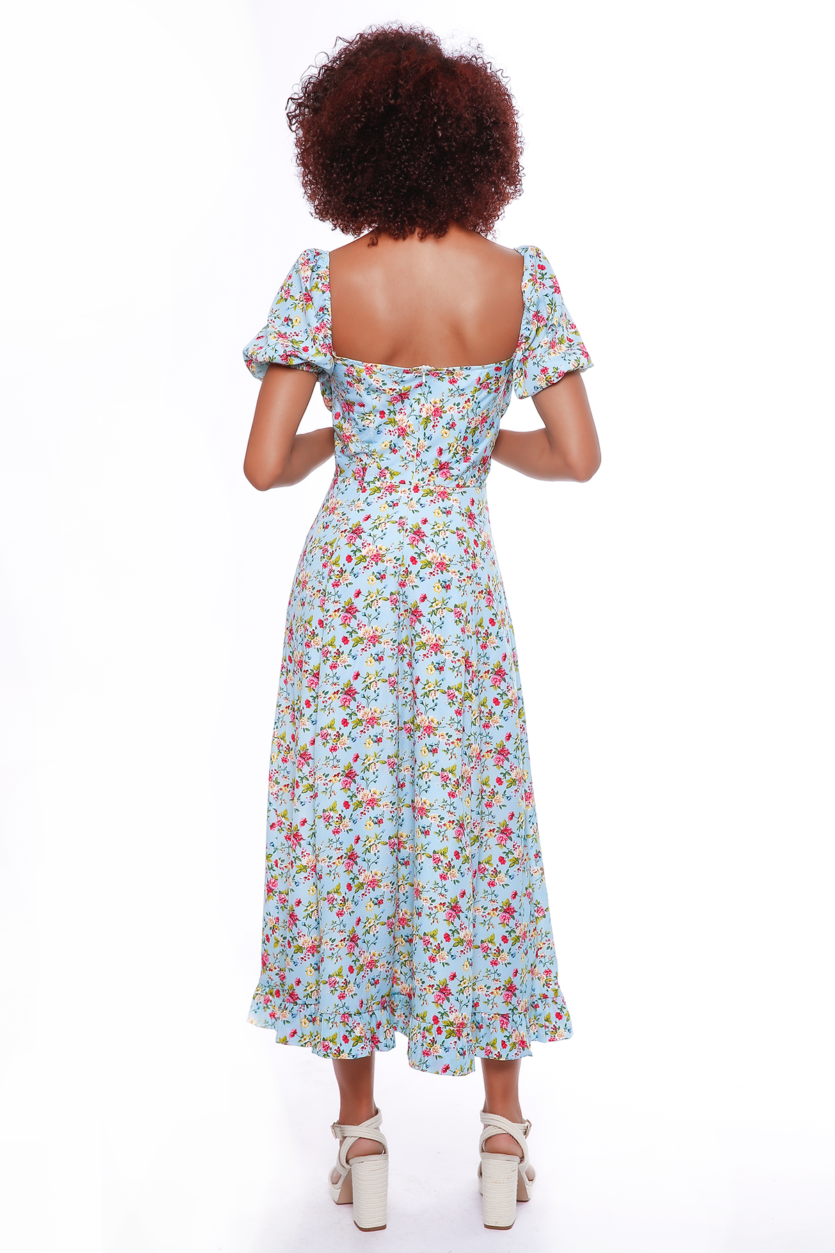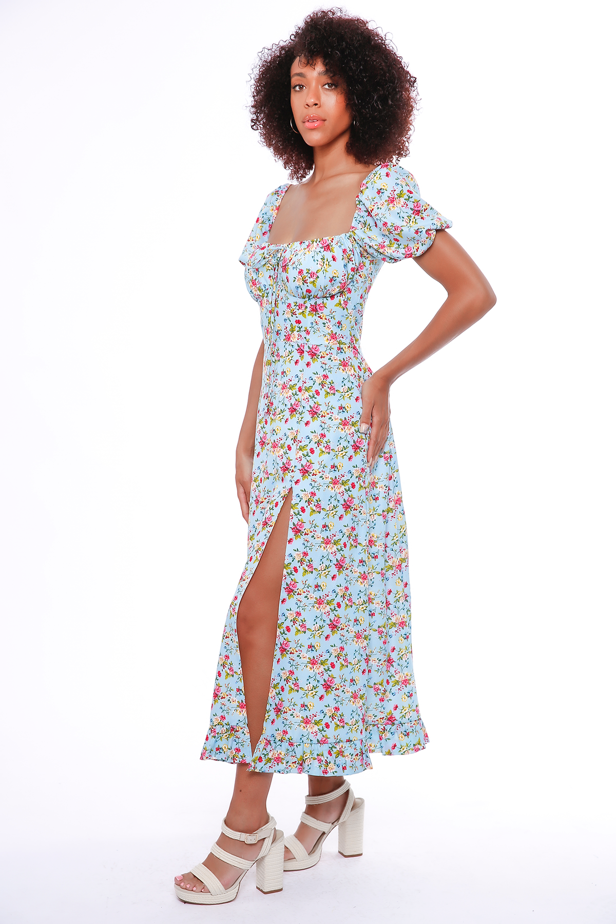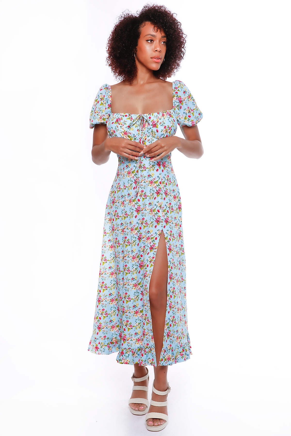 The Cecile is an A-lined midi length dress that features a gathered bust with a tie at front. She has a side split, a delicate ruffle hem and elastic puff sleeves.