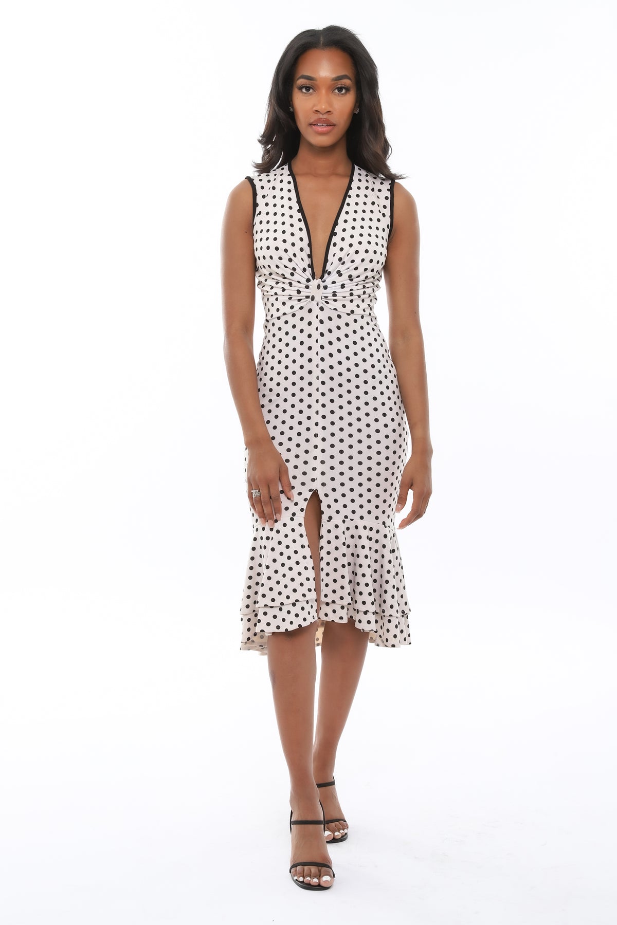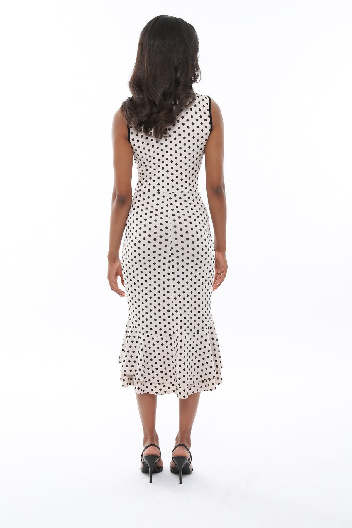 The Louise has a slim fitting bodice with plunging neckline in classic polka dot. She's sleeveless with contrasting binding and straight silhouette that continues into tiered flounce ruffles.