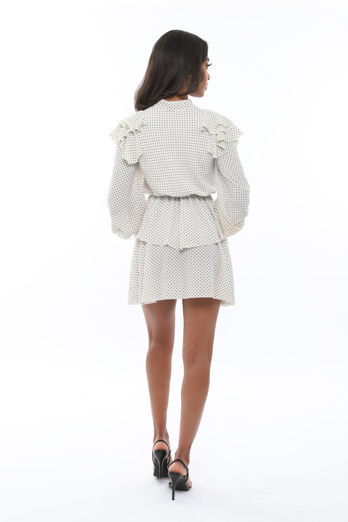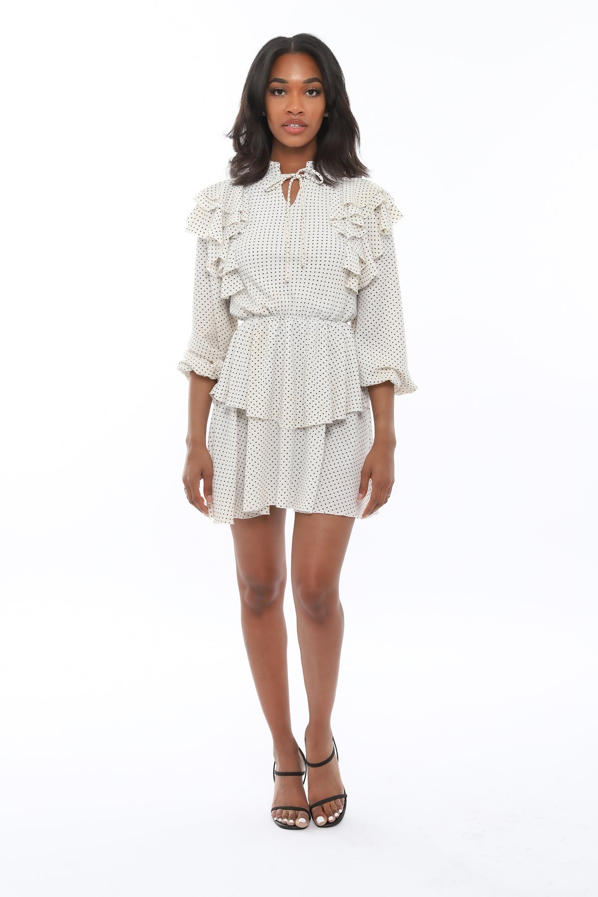 The Mirabelle has an easy cinched elastic waist with a double flounce skirt. She has an added touch with a ruffle - flounce bodice and billowy sleeves. She's in classic mini polka dots.
