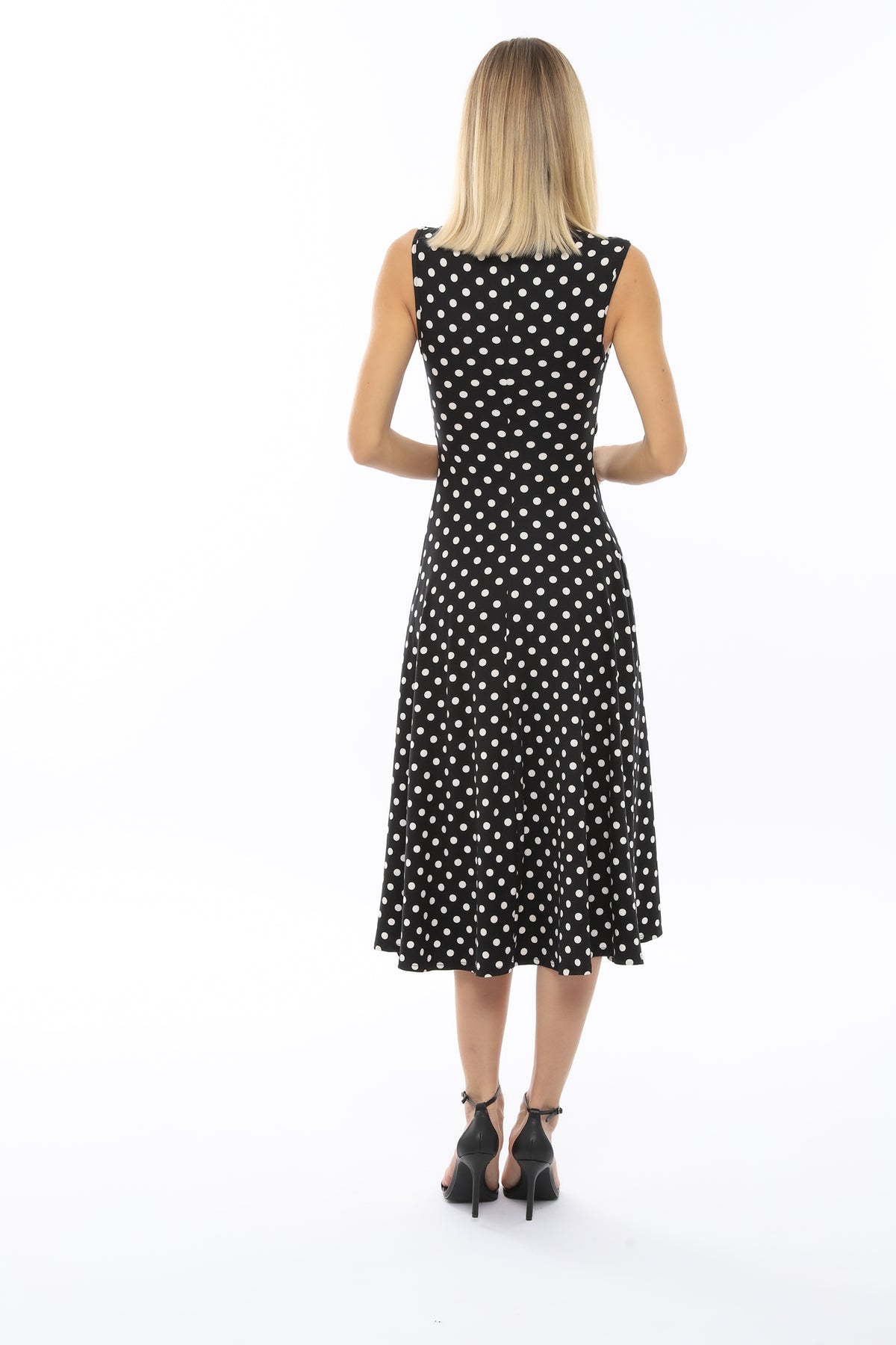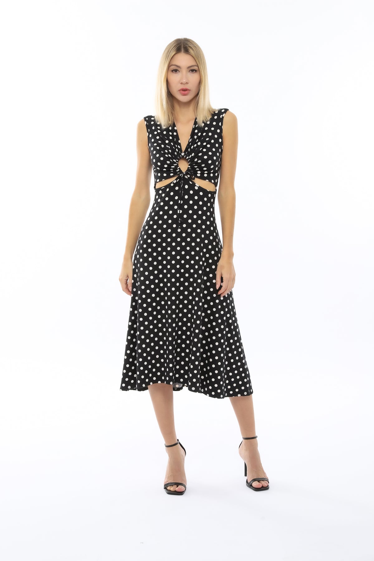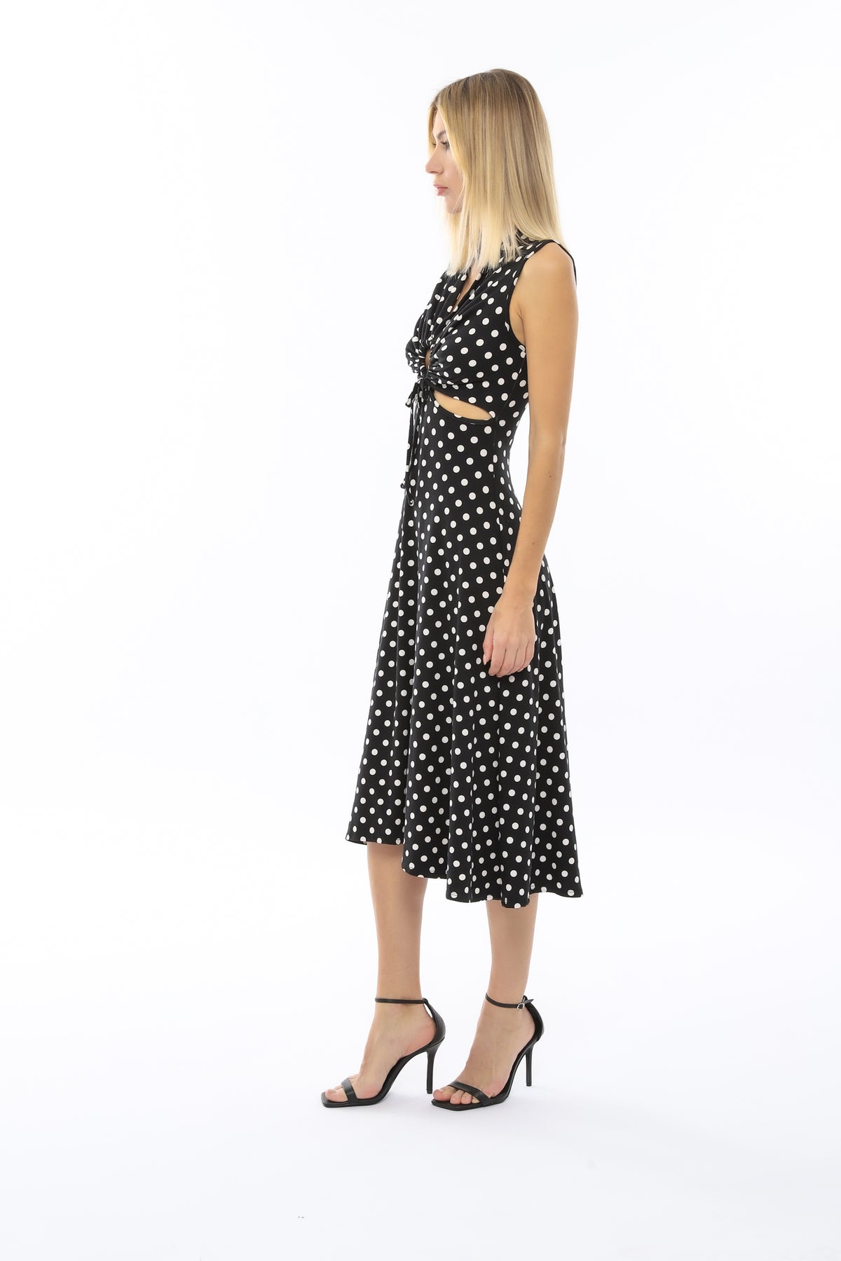 The Rochelle is a slim-fitting sleeveless A-line silhouette with bare midriff. It has a cool front detail with a gathered keyhole and spaghetti ties. All of this in classic polka dot print.
