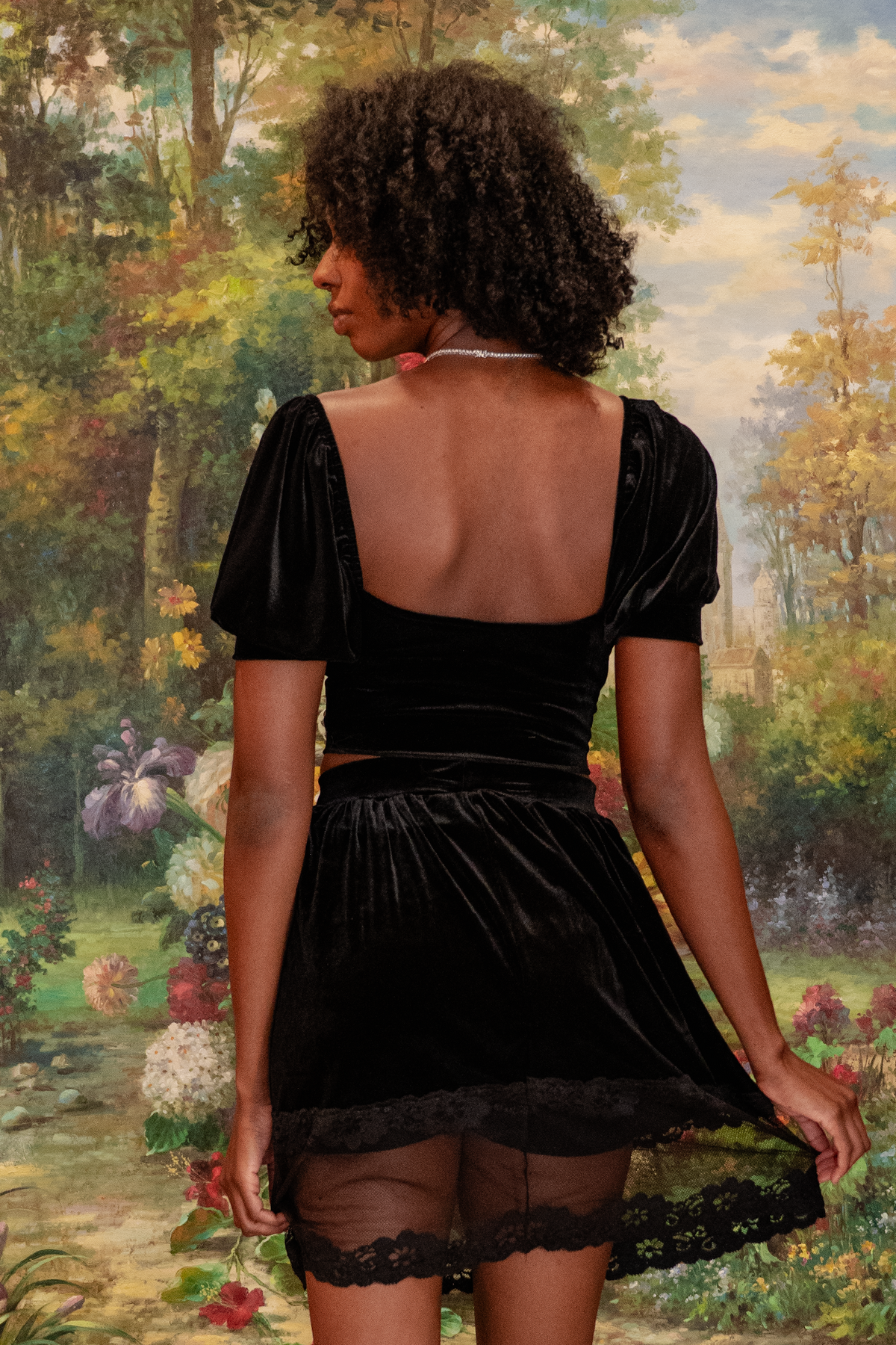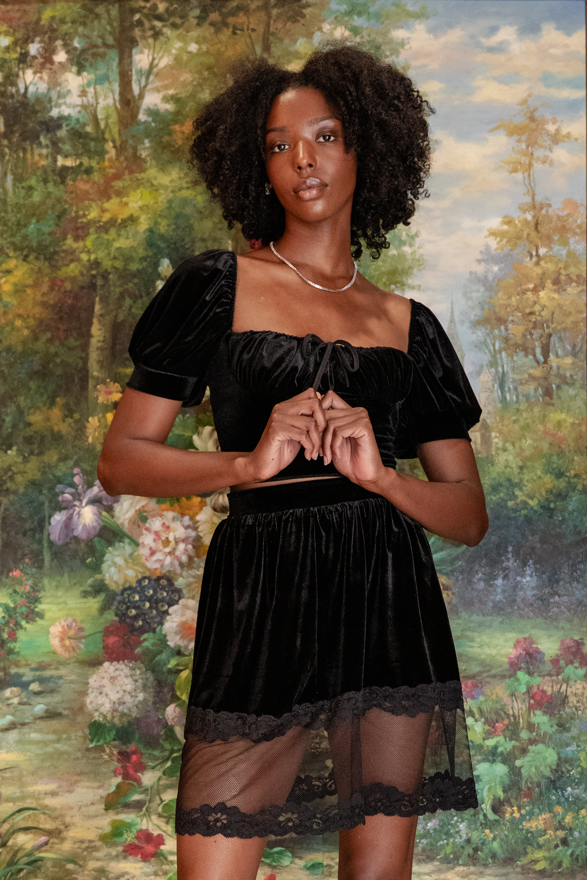Crafted from luxurious jet black stretch velvet, the set features a cropped tie-front top with a sheared bust and off-the-shoulder puff sleeves, paired with a flirty mini skirt made from French mesh netting. The skirt is finished with a covered elastic waistband and trimmed in vintage Venetian lace, creating a perfectly coordinated ensemble that balances elegance and playful sophistication.