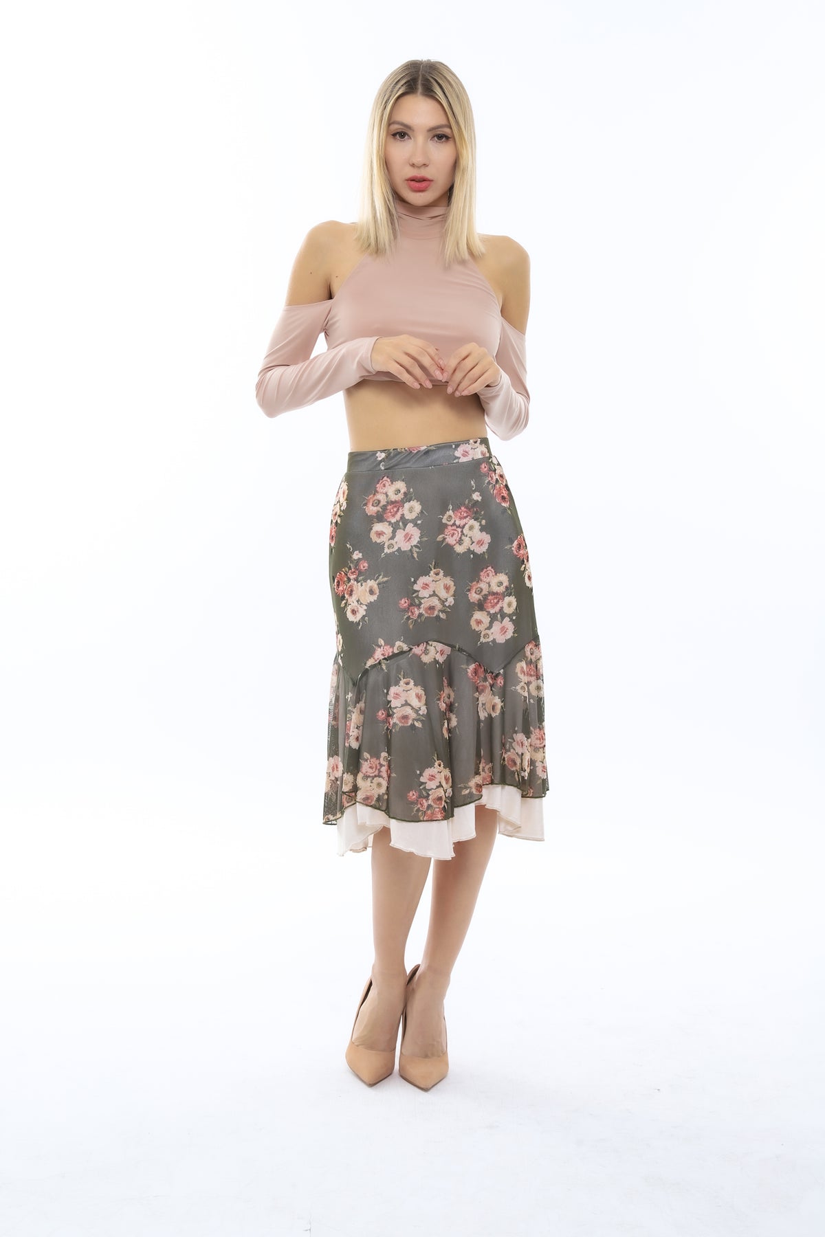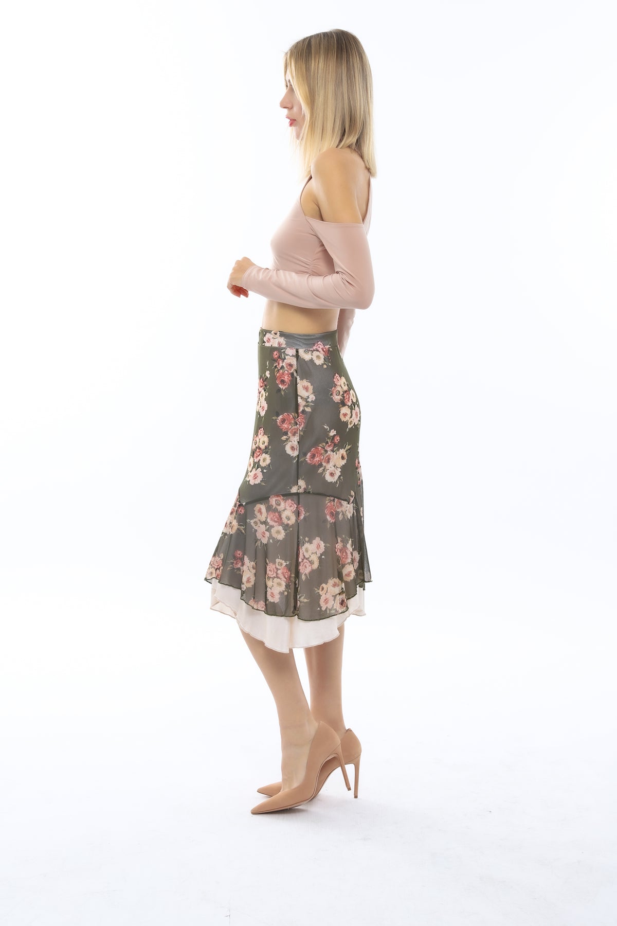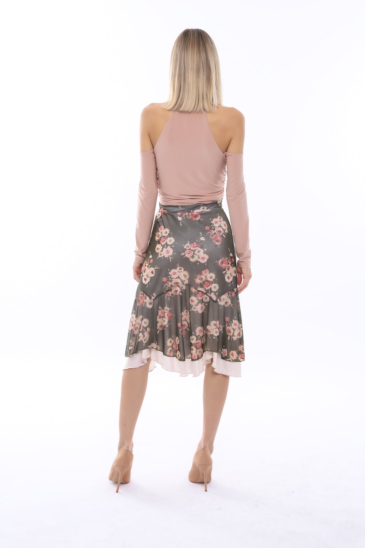 The Olivia skirt has a double flounce hem and midi lengths with satin underskirt that enhances your silhouette.