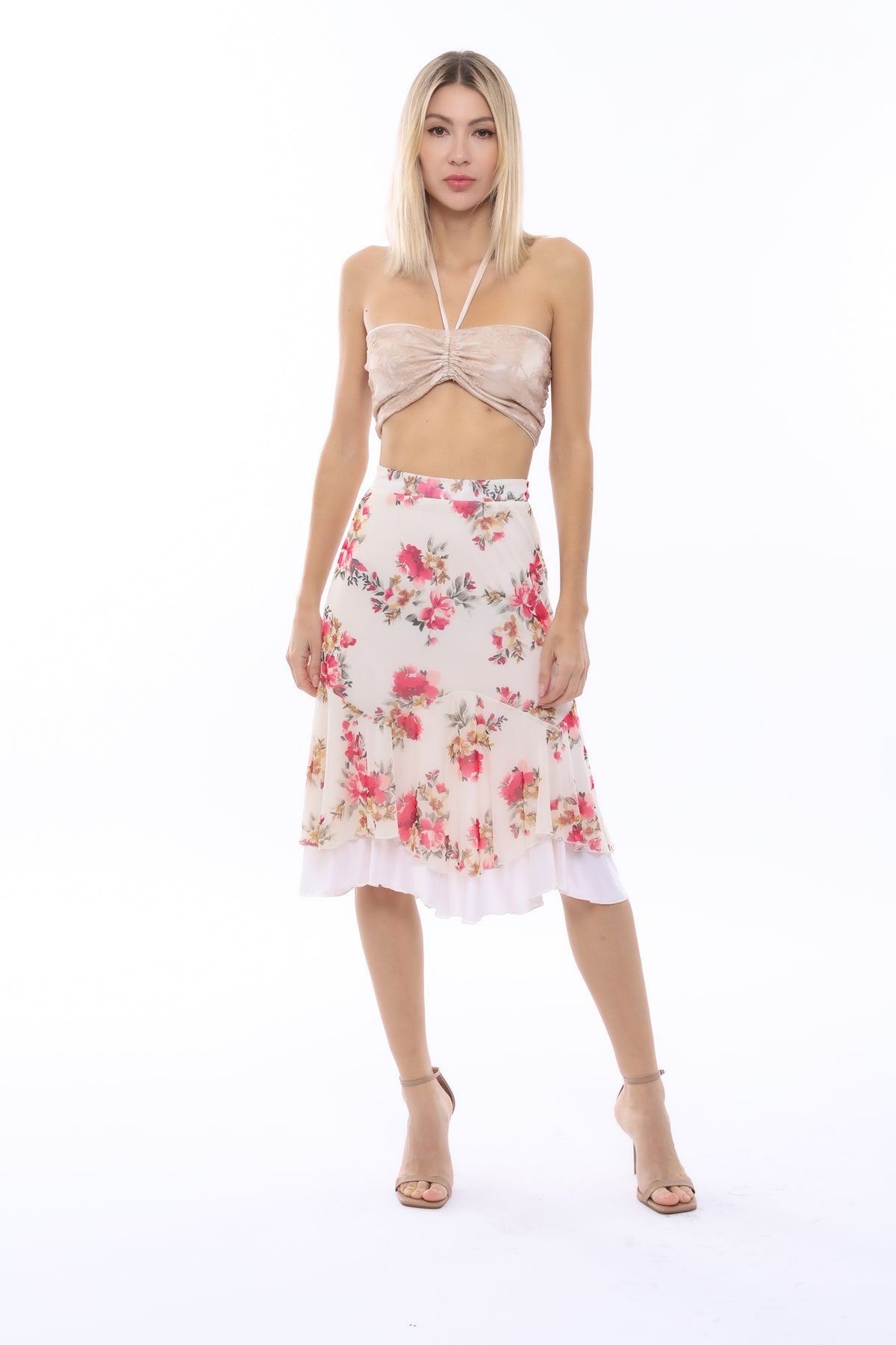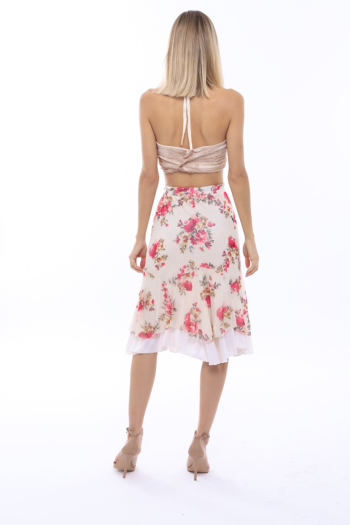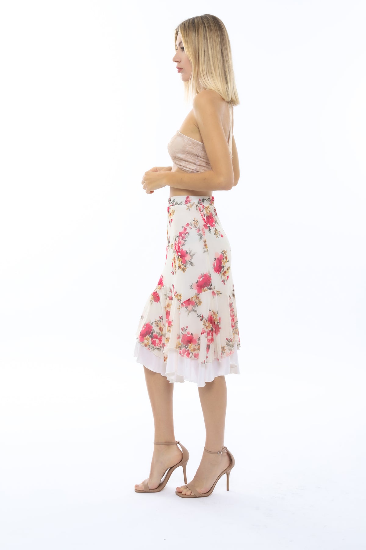 The Sacha skirt has a double flounce hem and midi lengths with satin underskirt. Giving a flattering silhouette.