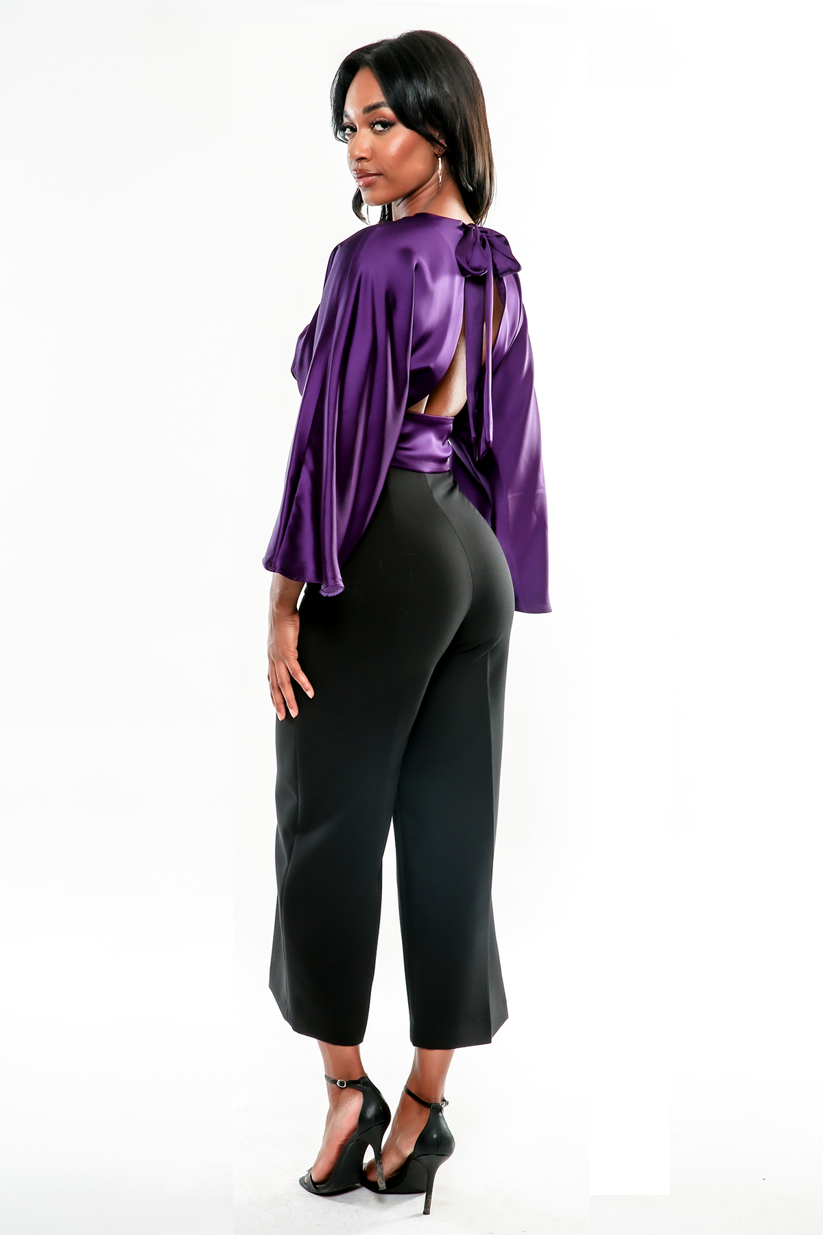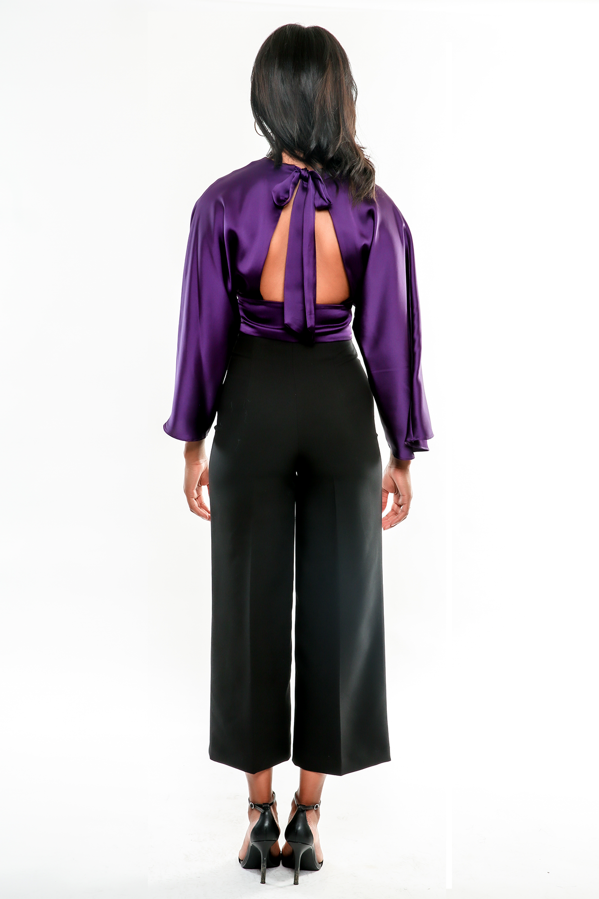 The Mya is a luxurious feeling top in deep purple with dramatic sleeves. It has an open back, with adjustable tie at neck. Pleated front, with full sleeves.