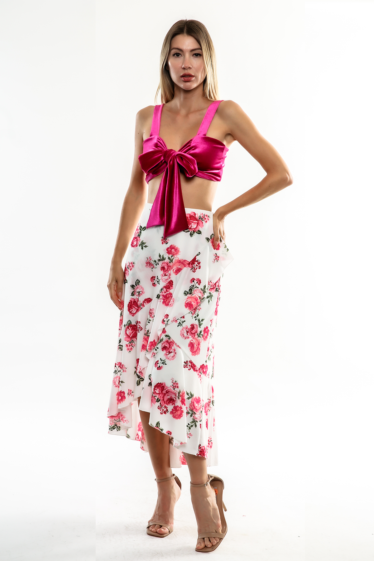 The Anastasia is a cropped top with straps in stretch Velvet with a romantic detail at the center front.