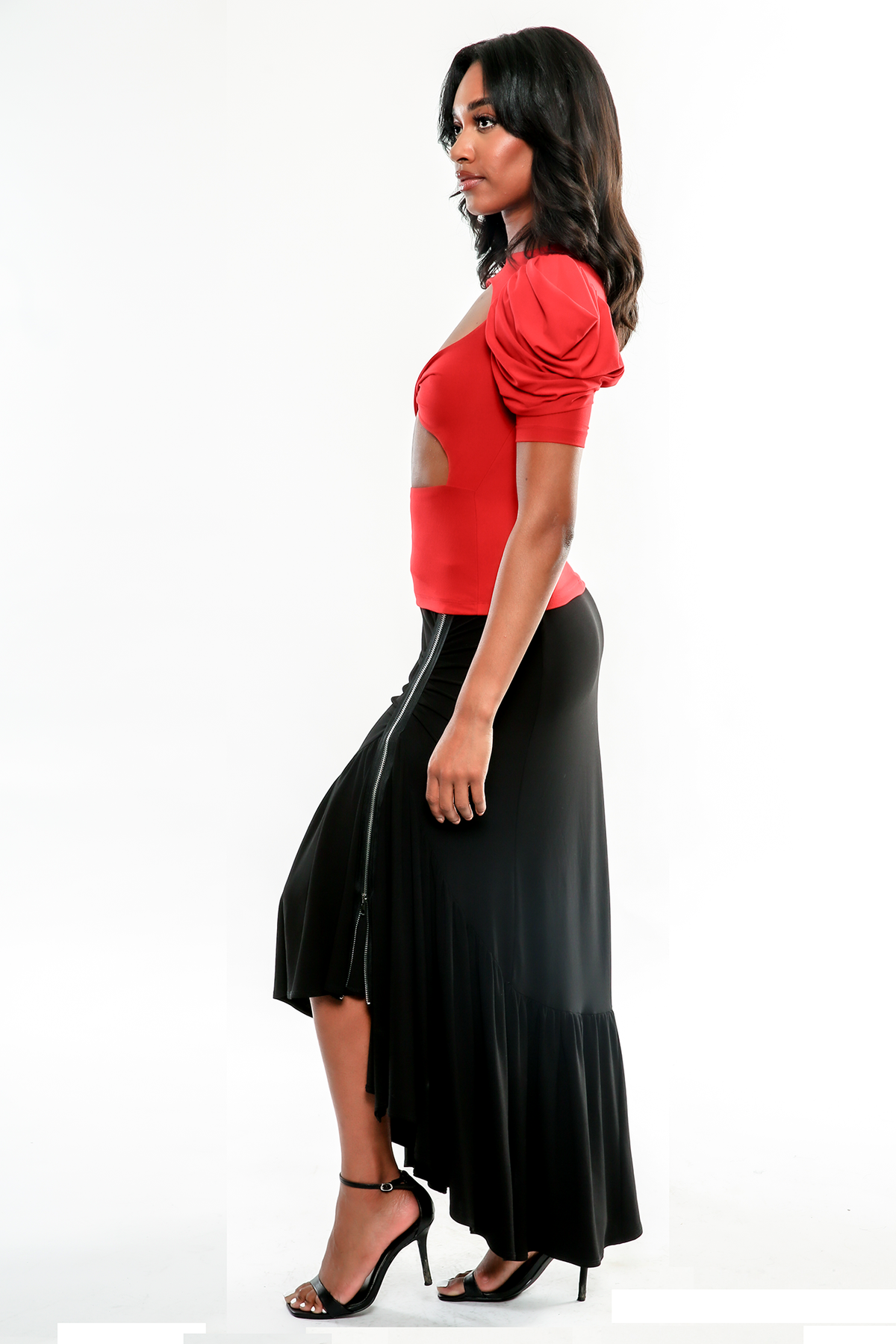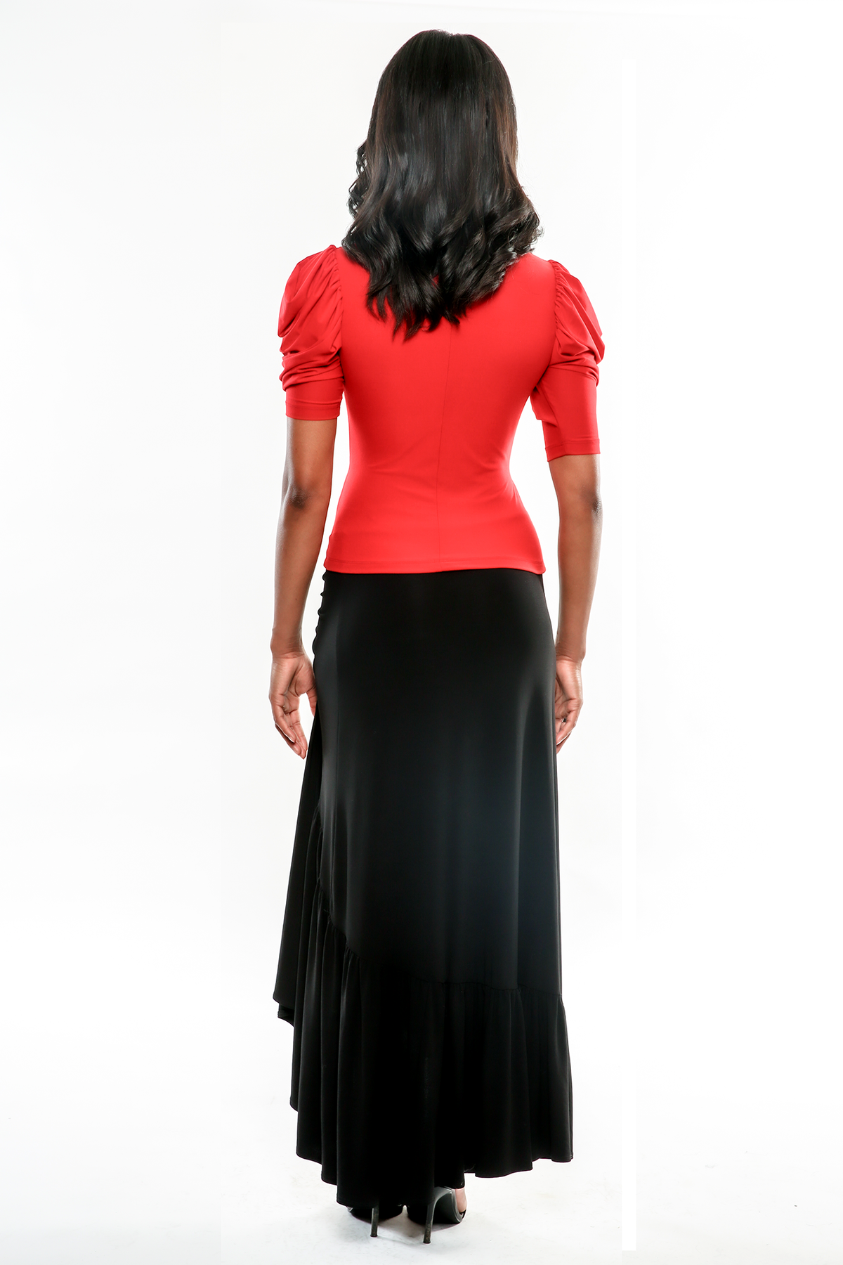 The Mélinda is a slim fitting silhouette top, with dramatic draped sleeve cap. It features a twist, cutout neckline detail. The Mélinda is paired with the Noella skirt in the product pictures.