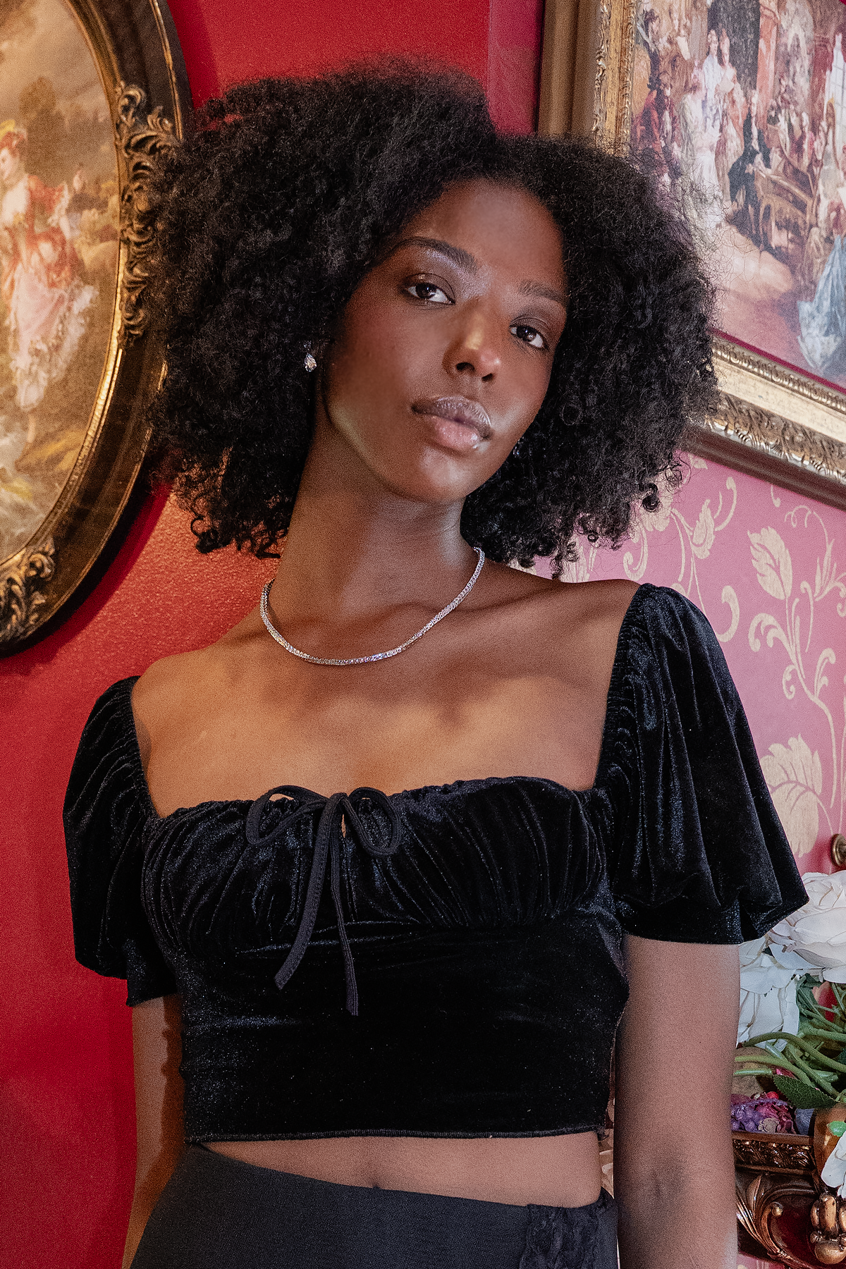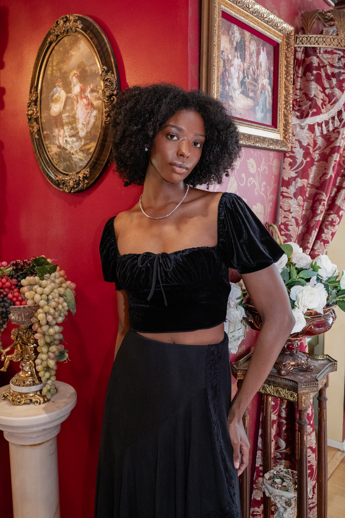 Crafted from luxurious jet black stretch velvet and rayon mesh, the set features a cropped tie-front top with a sheared bust and off-the-shoulder puff sleeves, paired with a mid-calf wrap skirt. The skirt is trimmed with vintage French lace and designed with a covered elastic waistband for comfort and ease. Together, the pieces create a beautifully feminine ensemble, ideal for evenings out or moments that call for effortless sophistication.