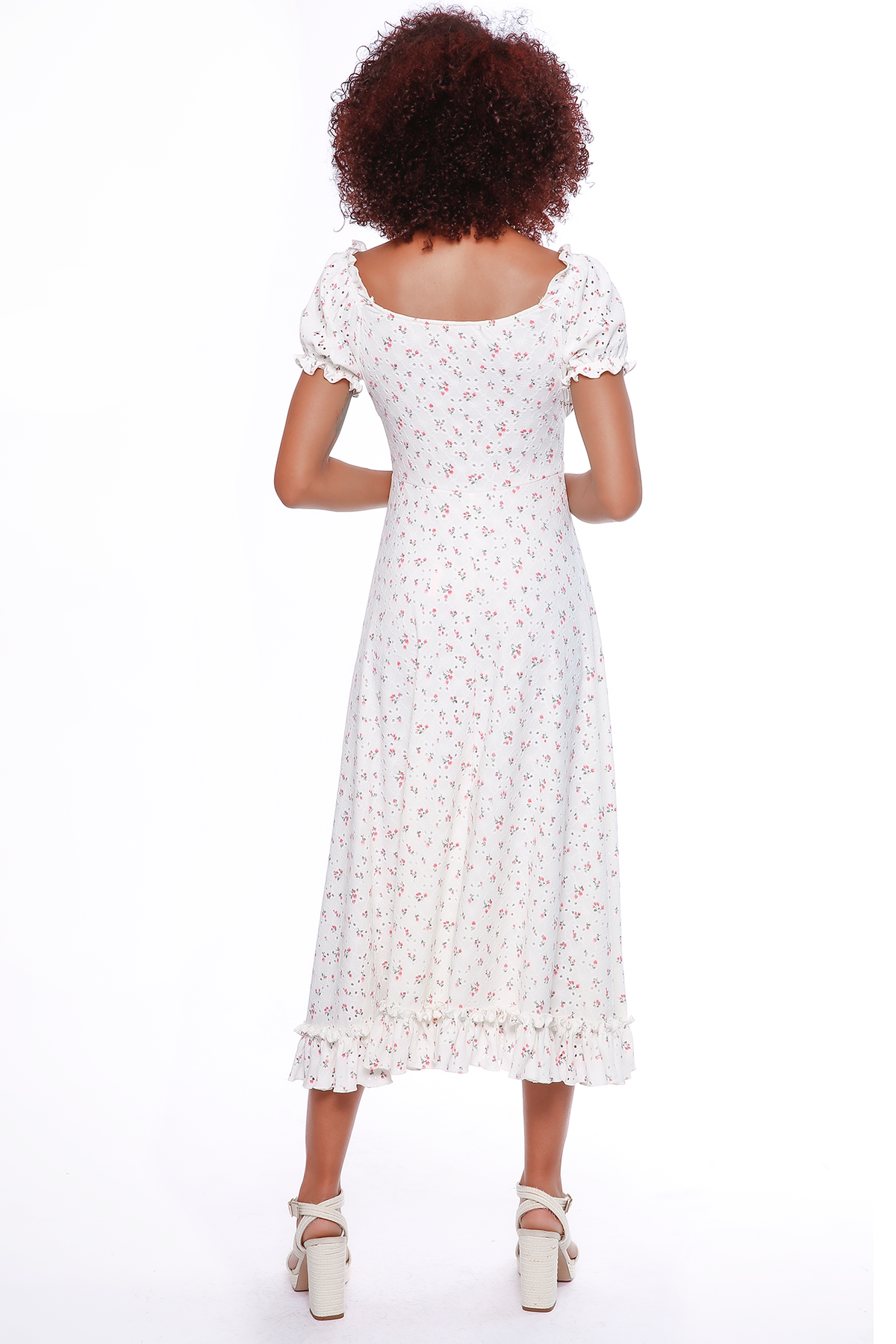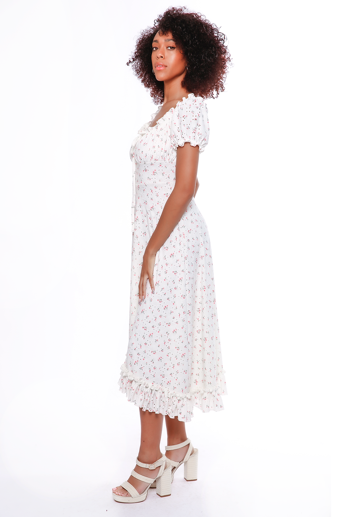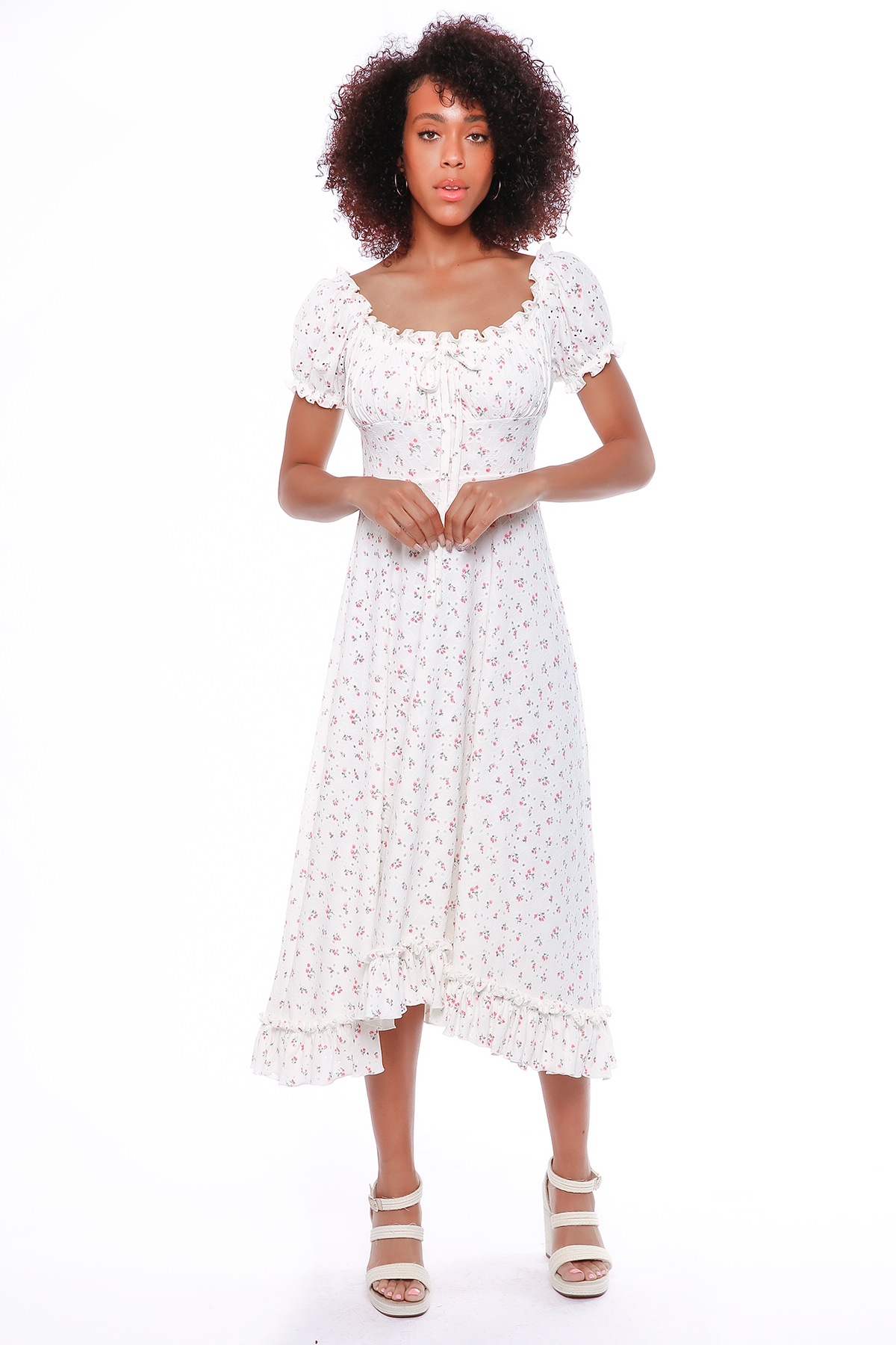 The Marguerite is an A-line midi length dress in stretch eyelet knit with a delicate ruffle at the hem. She has a gathered bust with front tie & elastic puff sleeves.