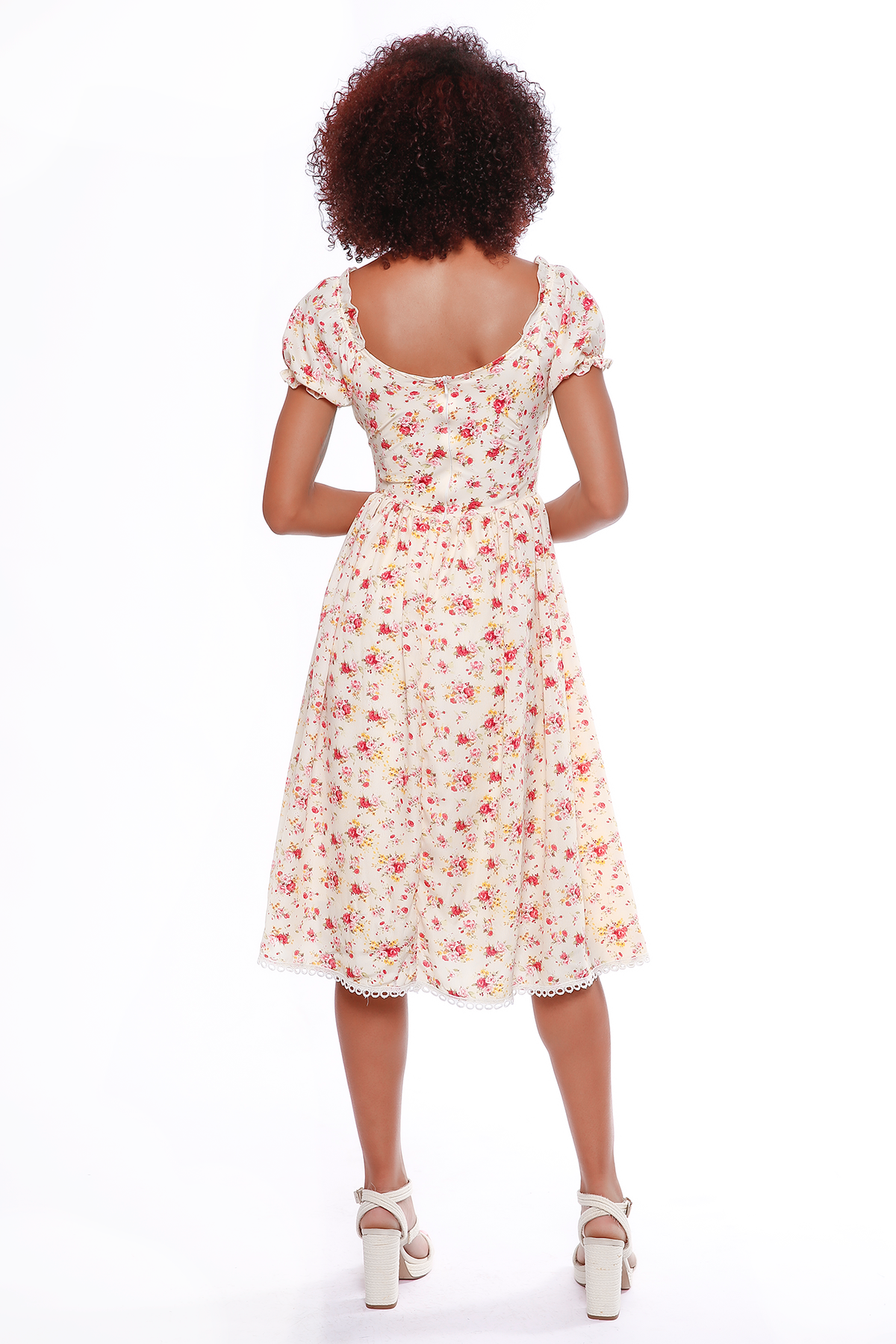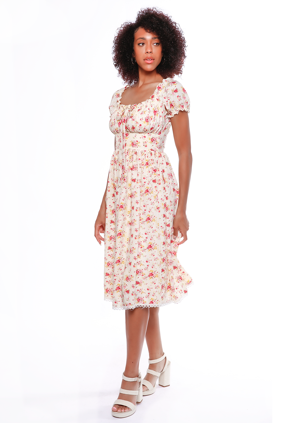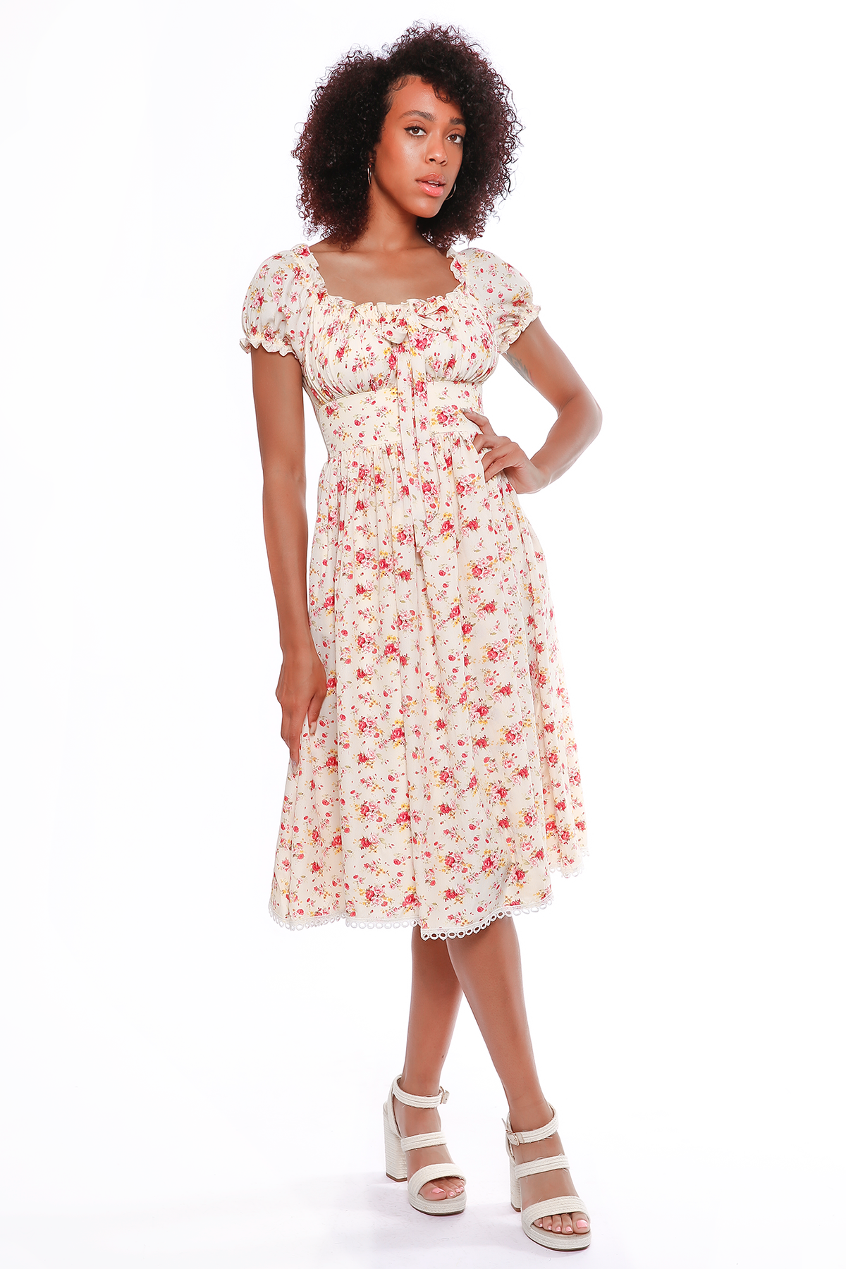 The Micaela has a gathered bust with a tie in the front. She is embellished with elastic puff sleeves and a gathered skirt with side pockets. Her hem is trimmed in scalloped French lace.